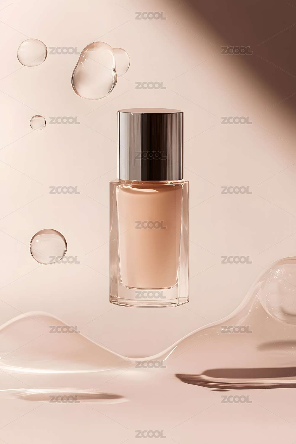 金色闪光绸缎上的高光粉底瓶产品摄影