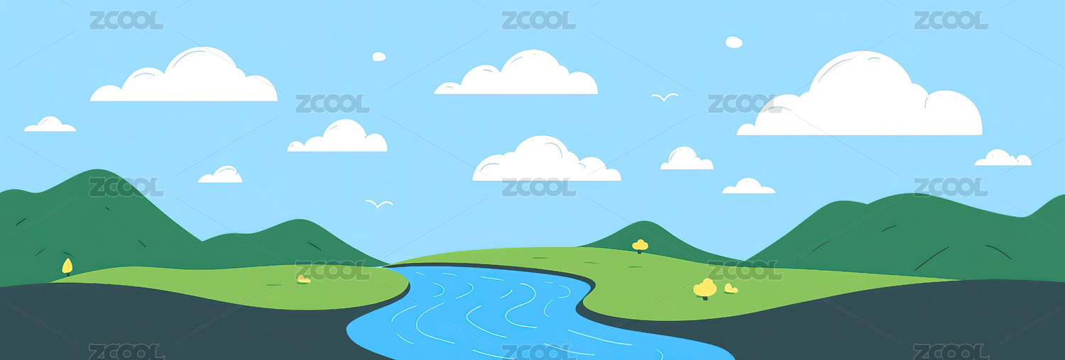 插画,卡通,扁平,天空,蓝色,云,山,绿色,树,灌木丛