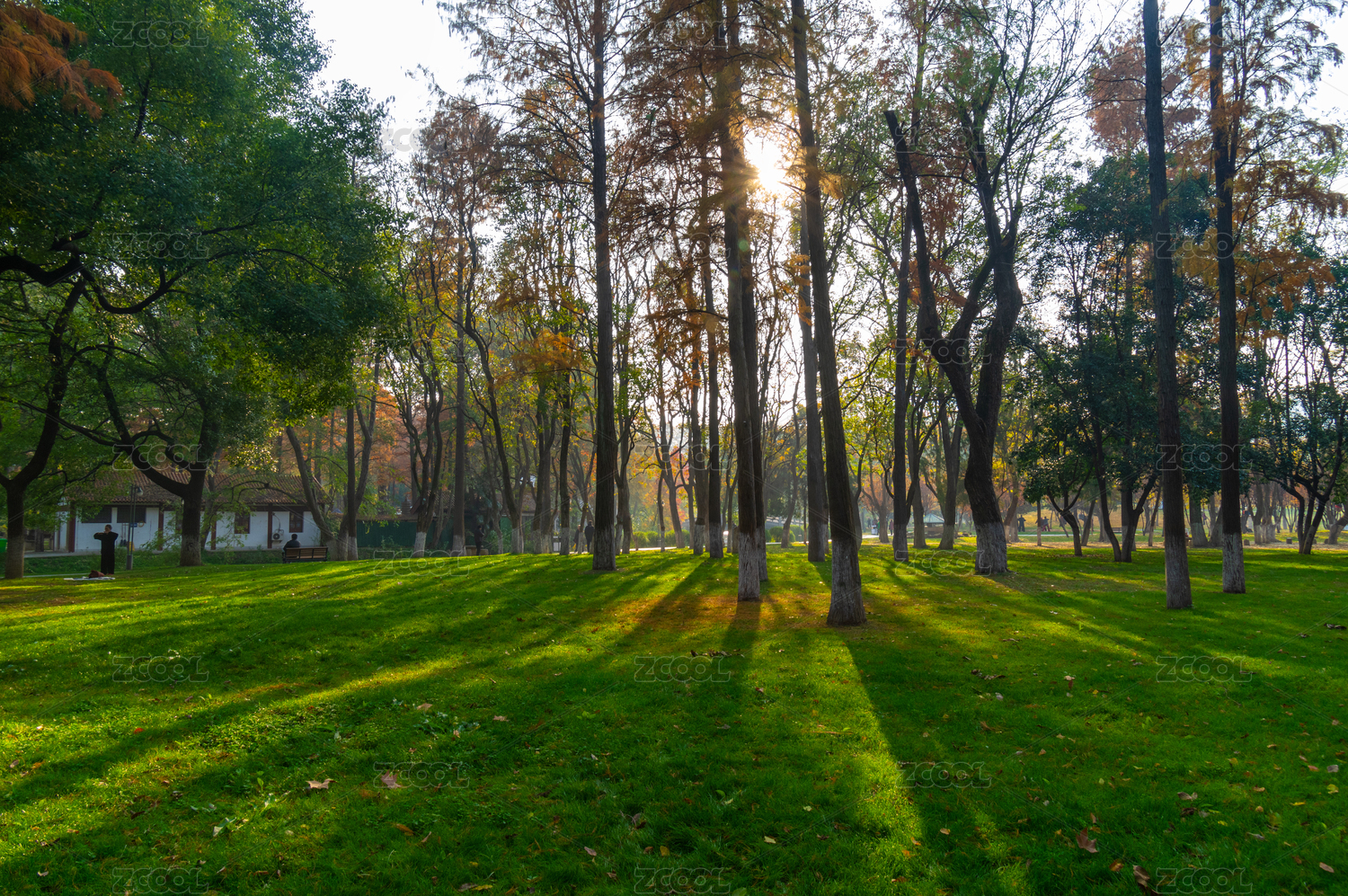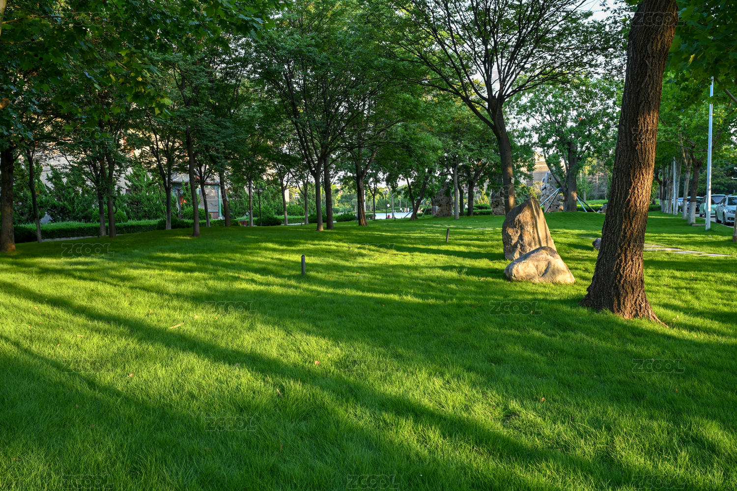 山东济南五龙潭公园内阳光下的树林绿草坪