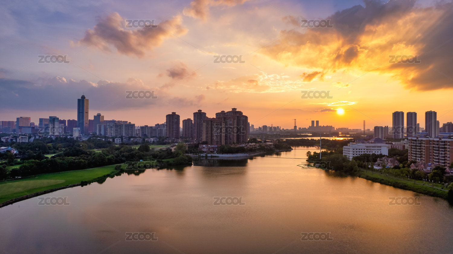 中国湖北武汉汉阳江滩傍晚城市航拍