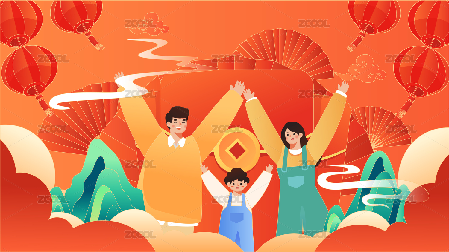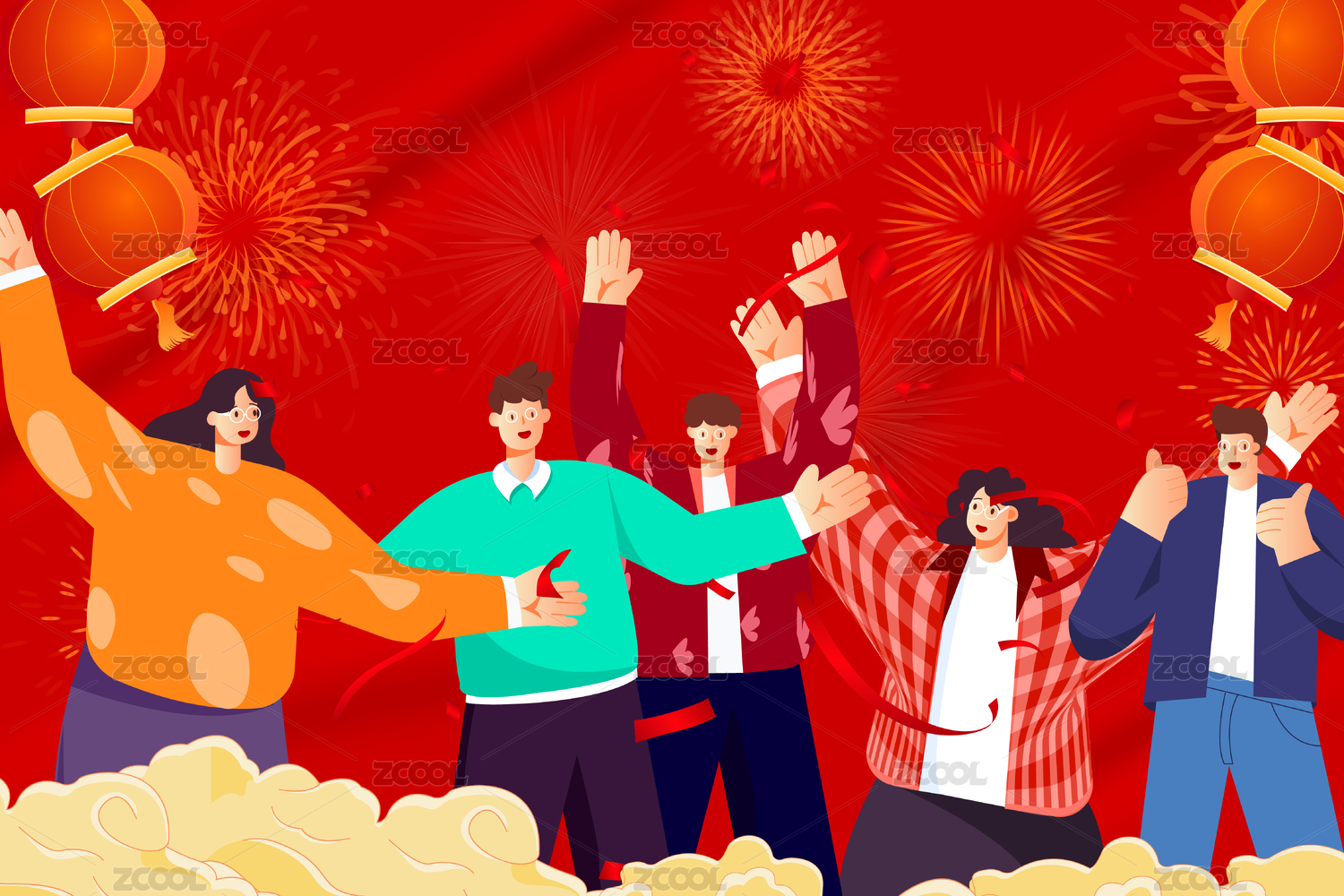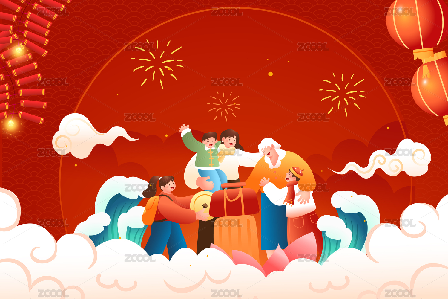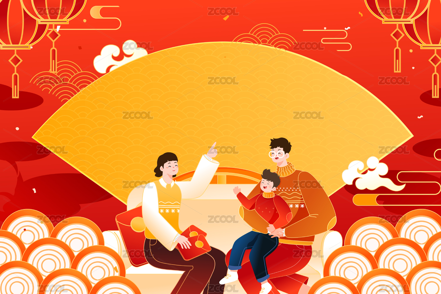 新春龙年过年人物传统喜庆矢量插画素材背景