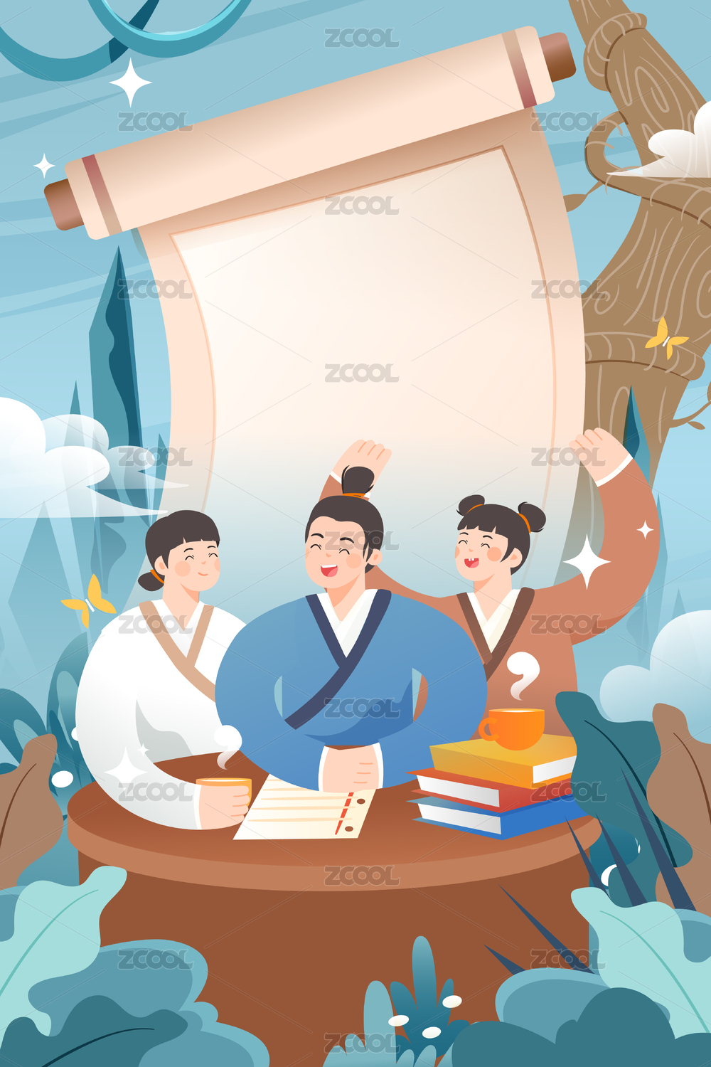 蓝色卡通古人夜晚点灯看卷轴学习元素