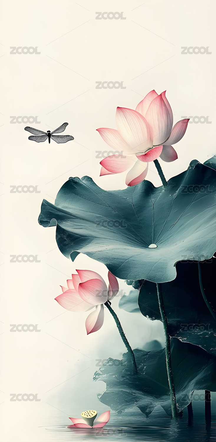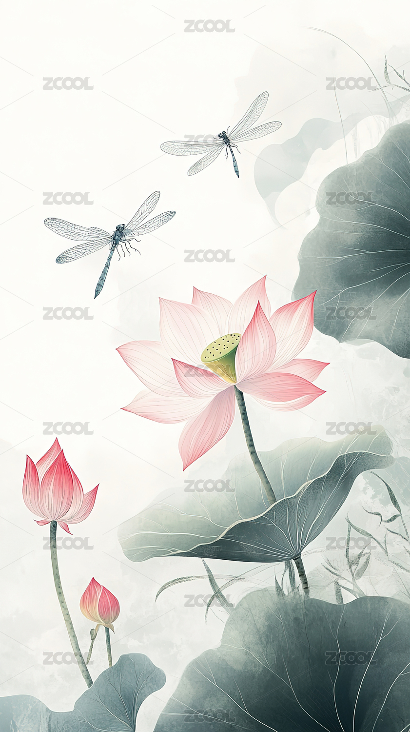 水墨,国风,中式,荷叶,水墨风,意境,荷花,蜻蜓,治愈,插画