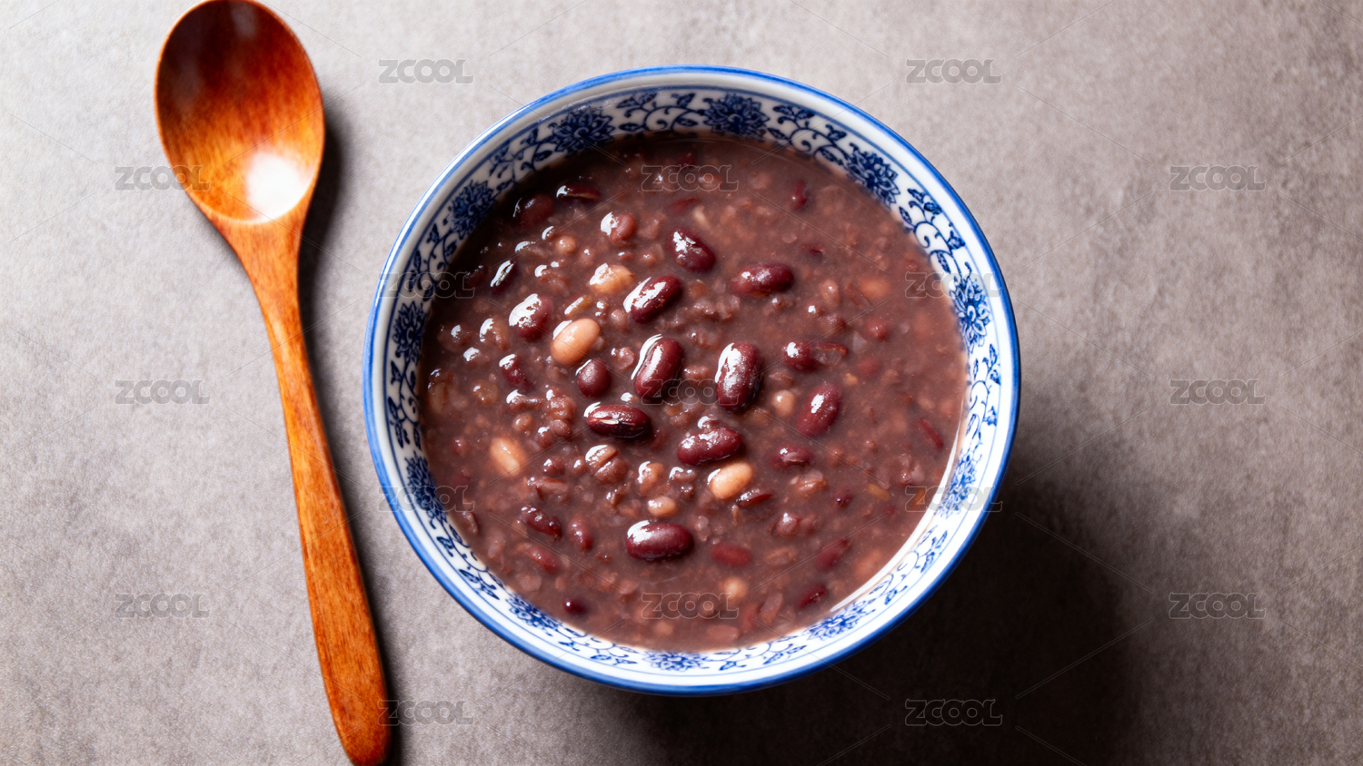 腊八粥与腊八米盛放在青花餐具中摆放在黑色背景上旁边摆放中国结