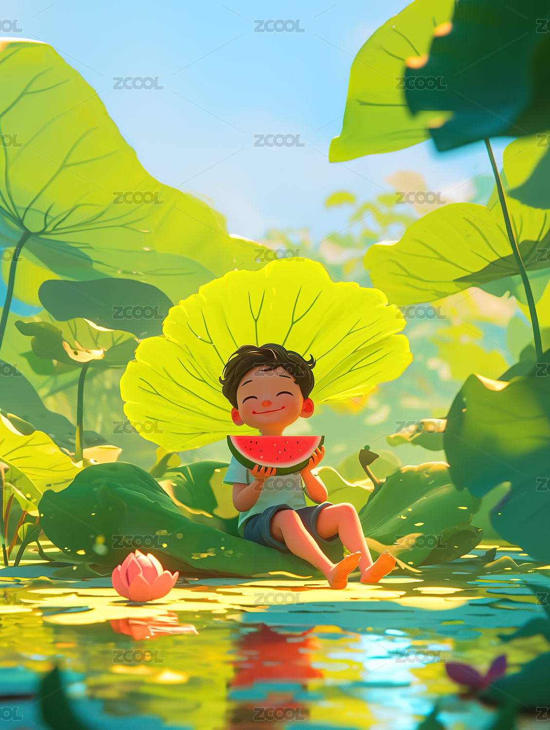 卡通插画风格两个小孩一起在湖边吃西瓜