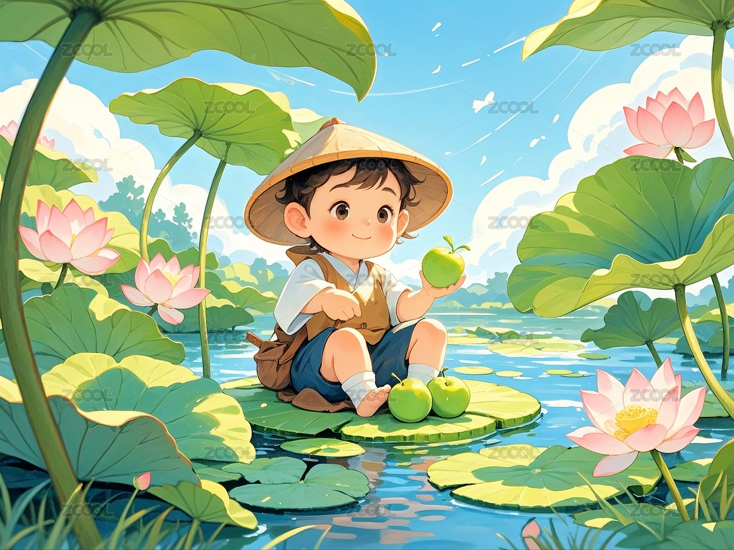 荷花,夏天,池子里,船,人物,吃东西,玩耍,绿色