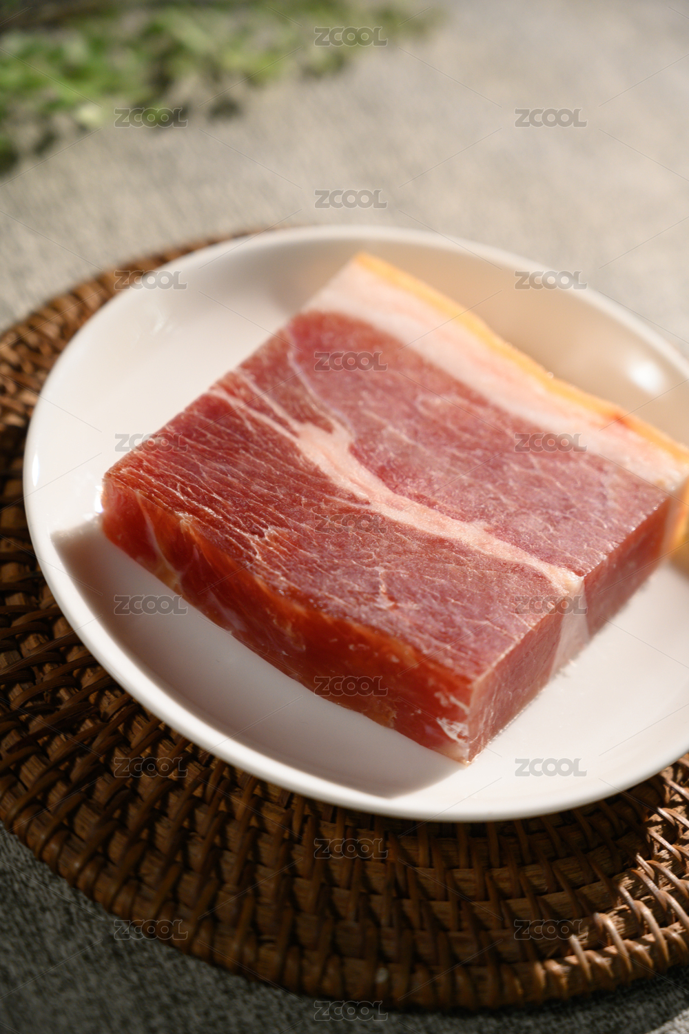 摆放在餐盘中新鲜的肥瘦相间的猪五花肉