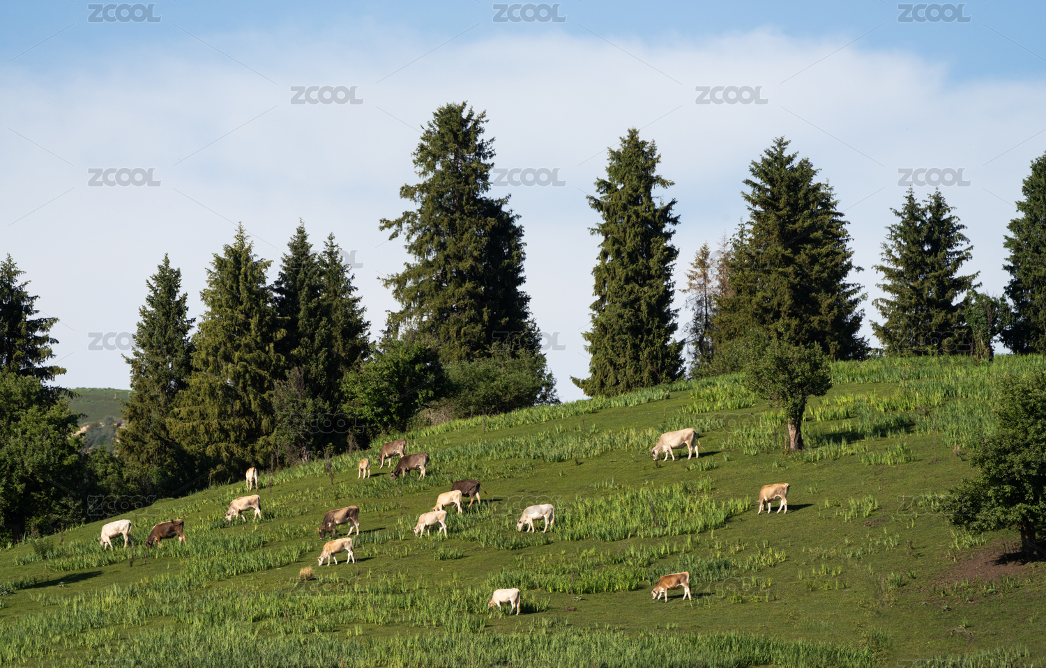 中国新疆伊犁那拉提草原盘龙谷道森林牛群