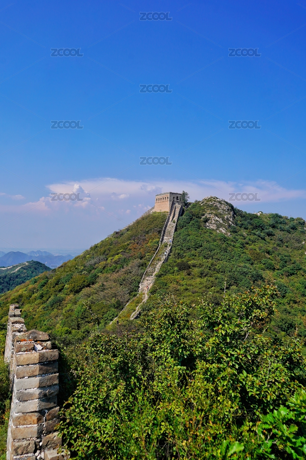 夏季北京慕田峪长城烽火台和连绵山脉风景
