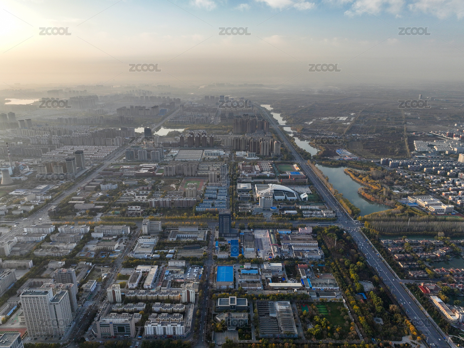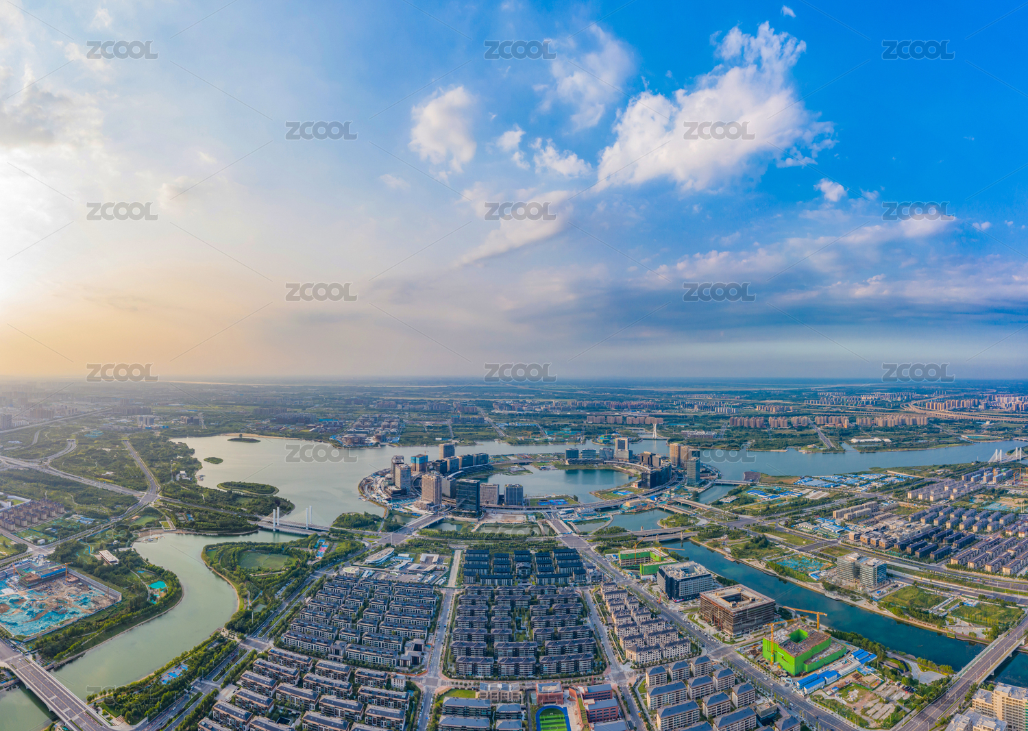航拍河南郑州郑东新区城市水系河道水网交错