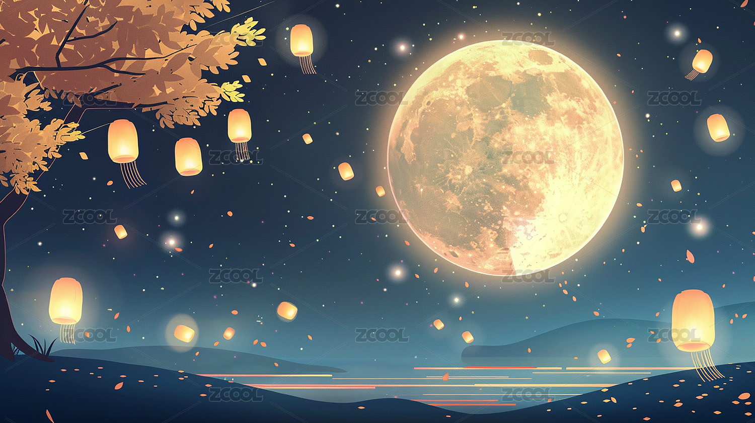 月亮,美,景色,夜晚,约会,氛围,灯火通明,蓝色,许愿,许愿灯