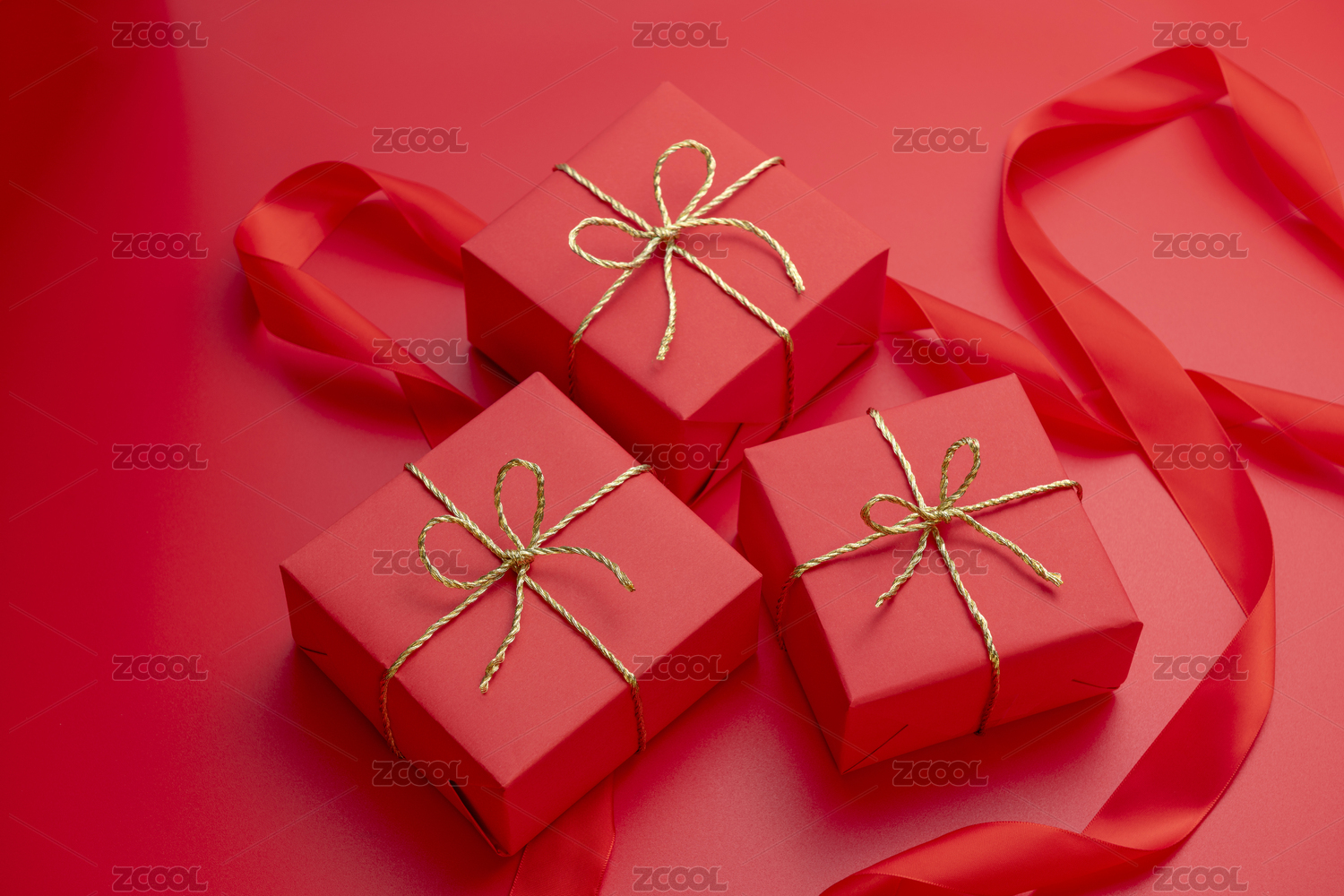 放在红色背景的绑着香槟色带子的红色礼物盒局部