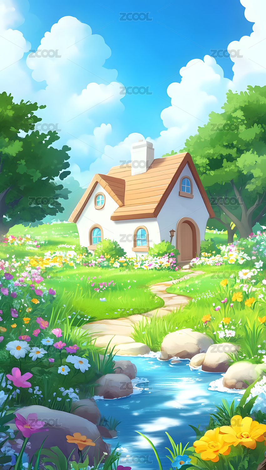 立夏节气户外房屋花草场景夏天旅行3D插画