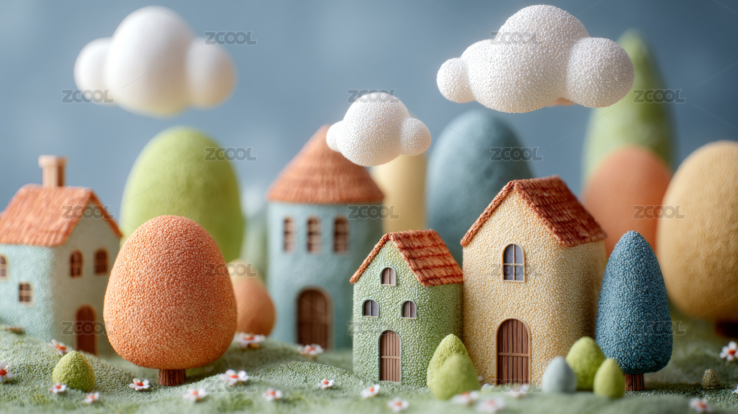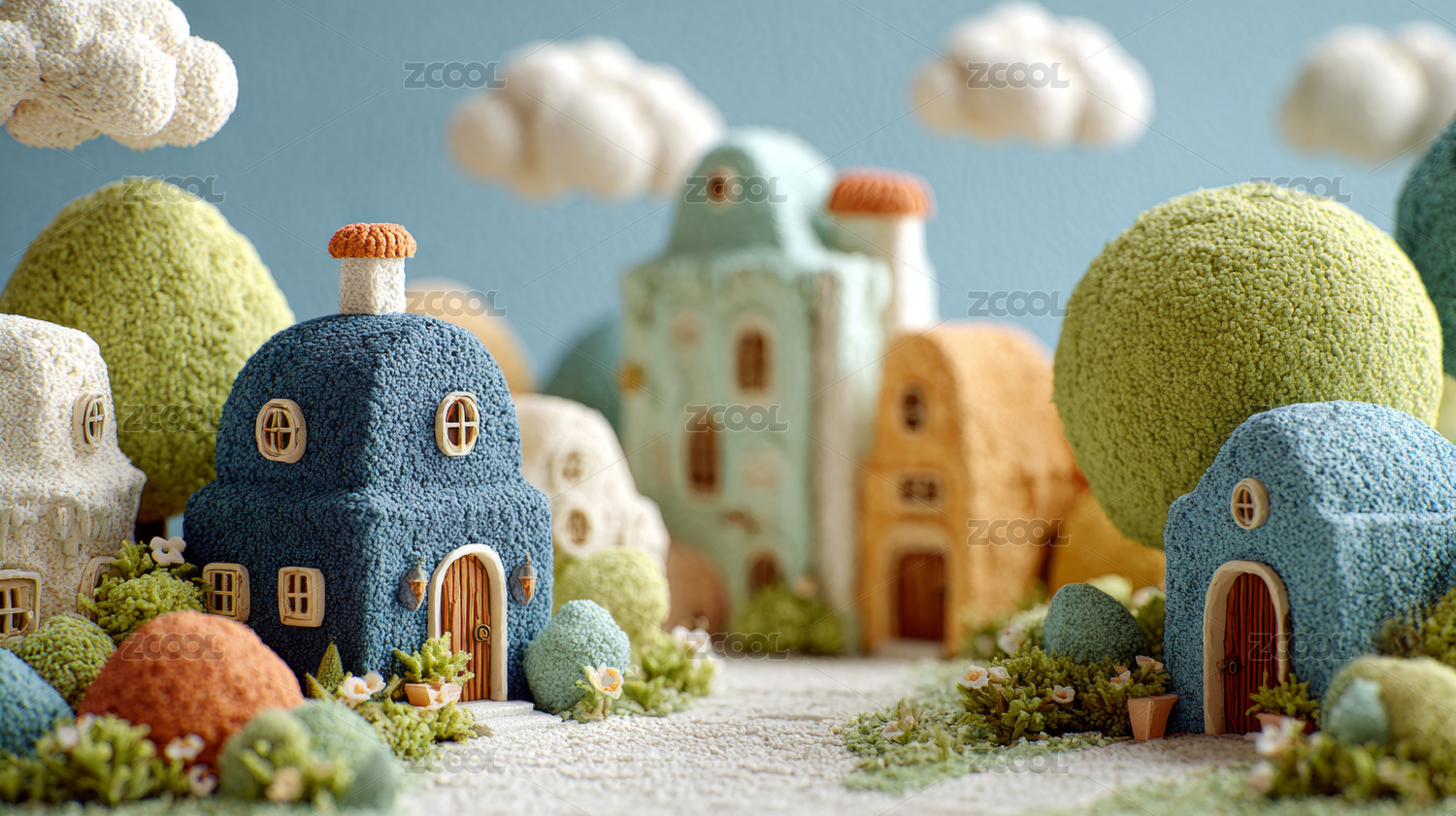 粉蓝羊毛毡小屋风景创意装饰背景图