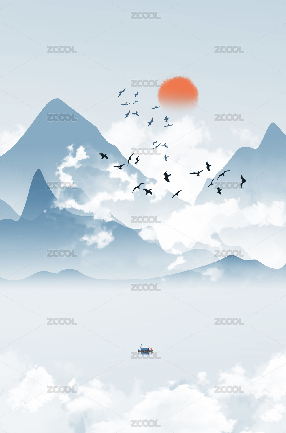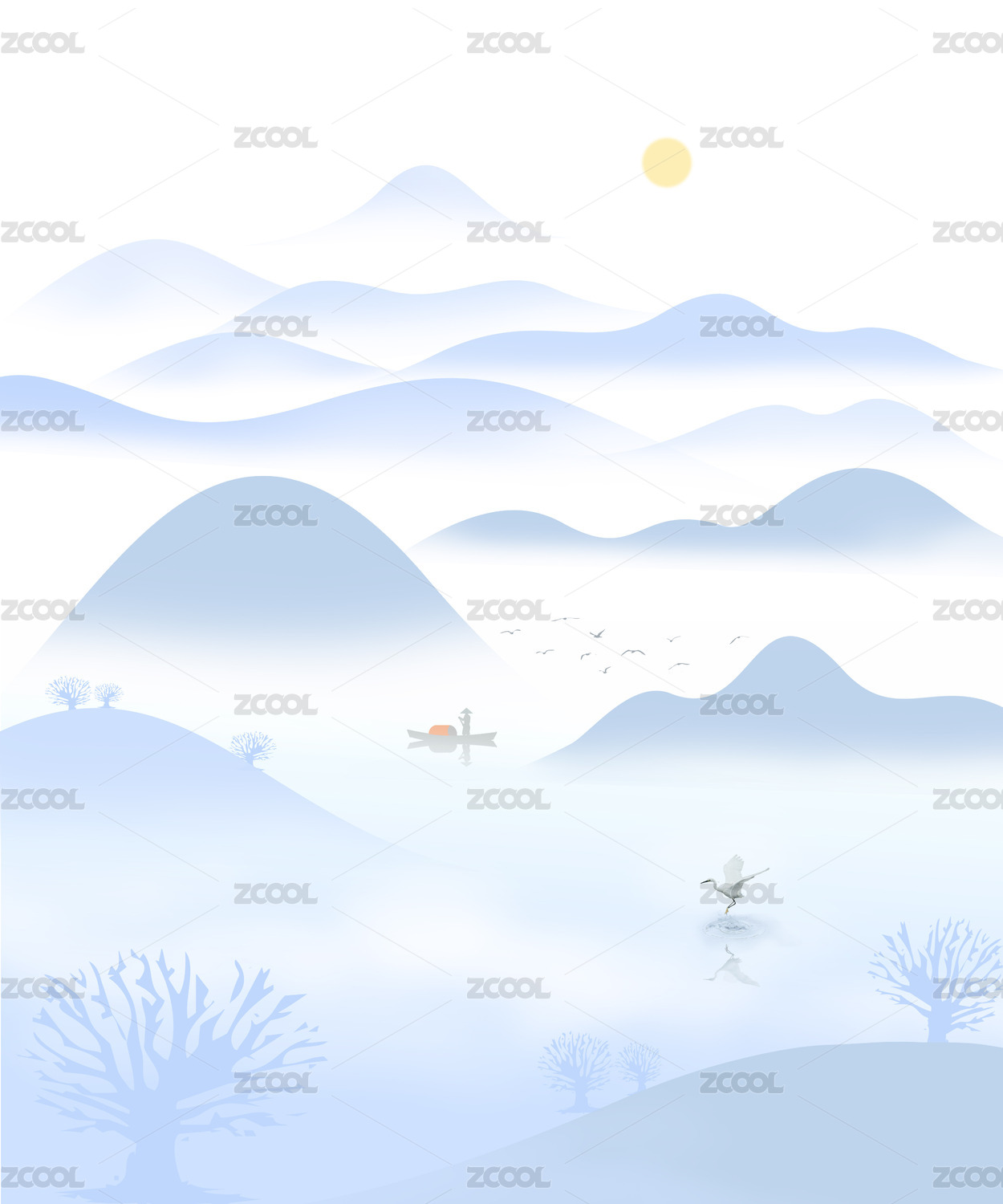 日出,被雾气笼罩的山川美景,蓝色唯美卡通水墨山川风景插画