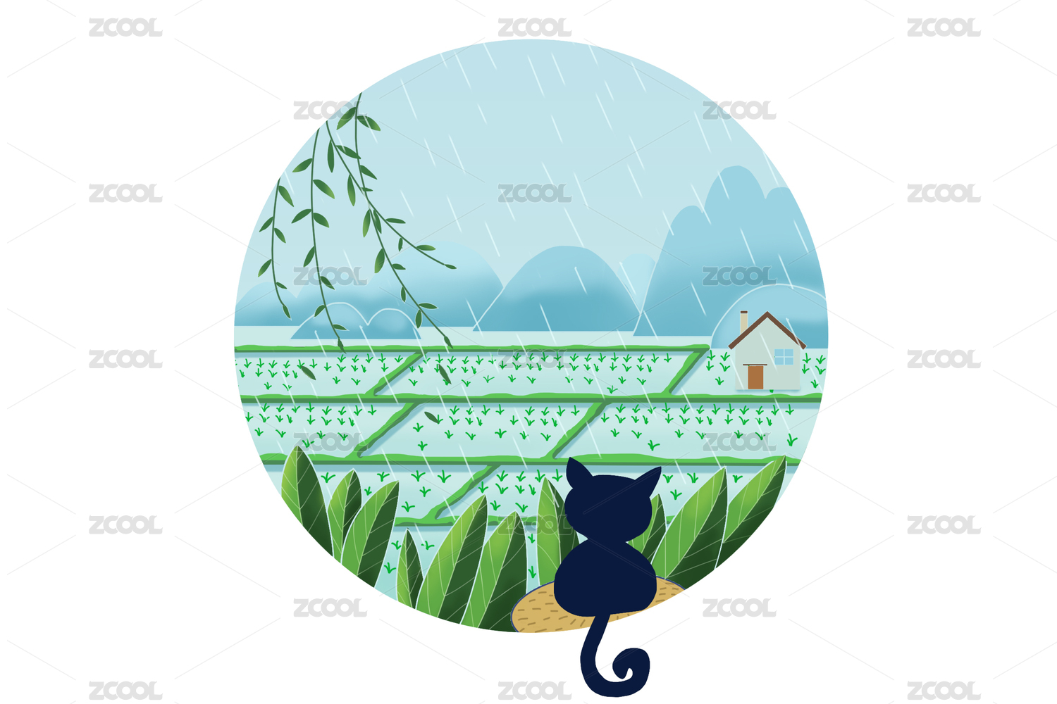谷雨节气雨天下的远山稻田房屋柳枝和猫
