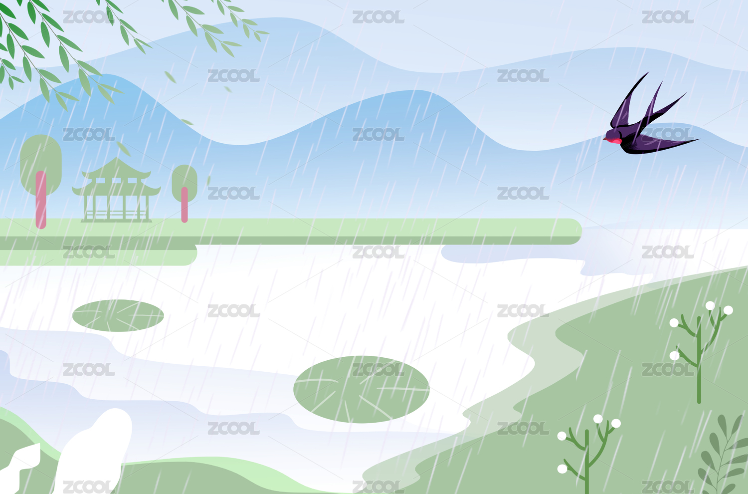 下雨天山丘燕子场景插画