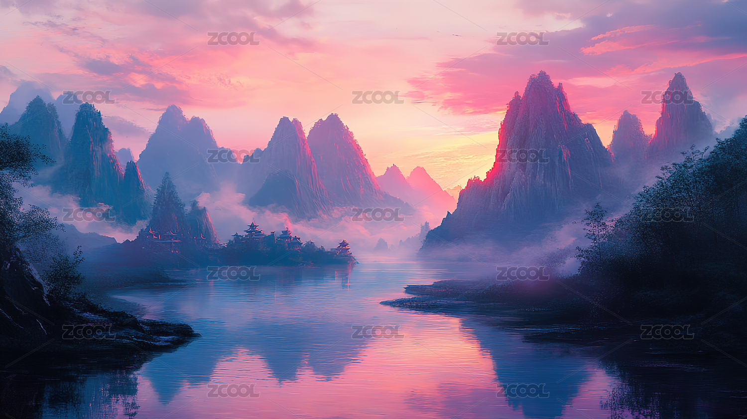 夜晚玄幻发光有莲花流水的瑶池3D立体插画