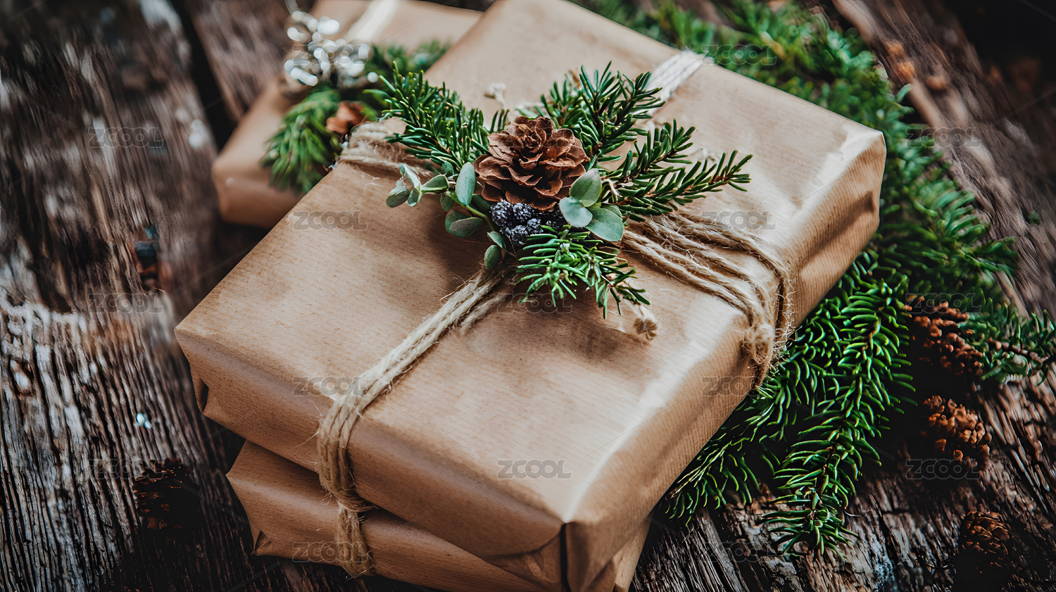 用绿色植物和松果装饰包装礼物