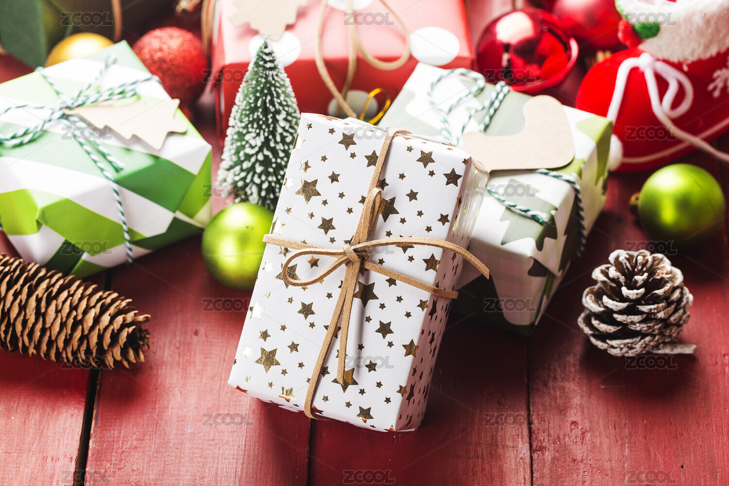 木桌面一角堆着礼盒和圣诞装饰物