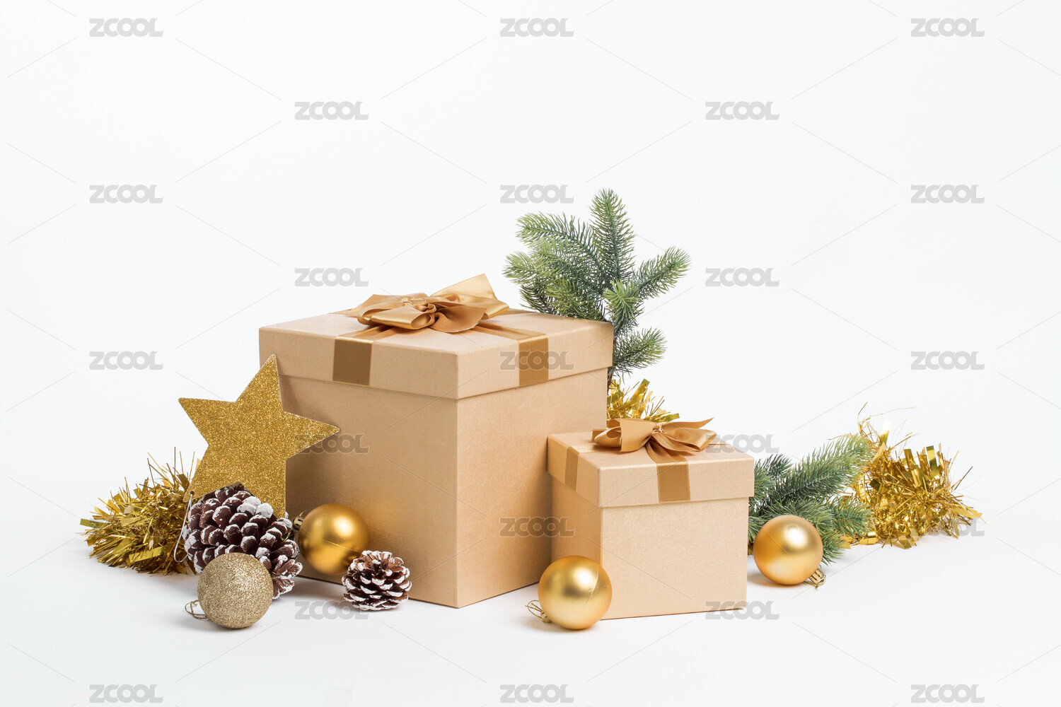 白底上有金色的礼盒和圣诞装饰物