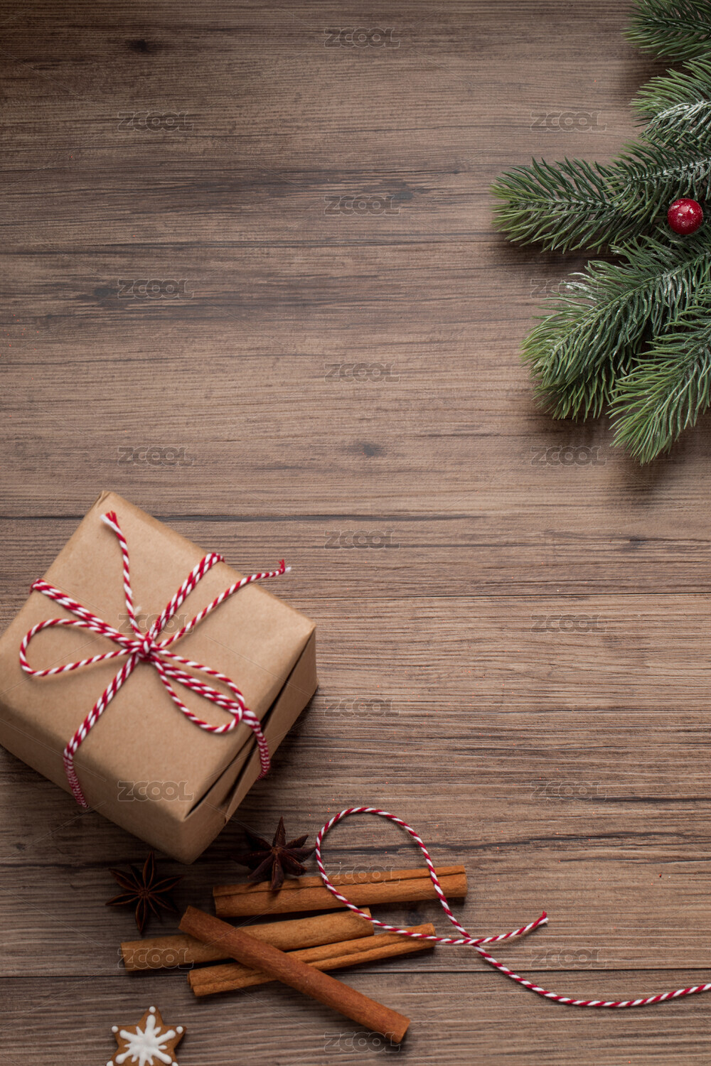 木桌面上放着一个礼盒和圣诞装饰物