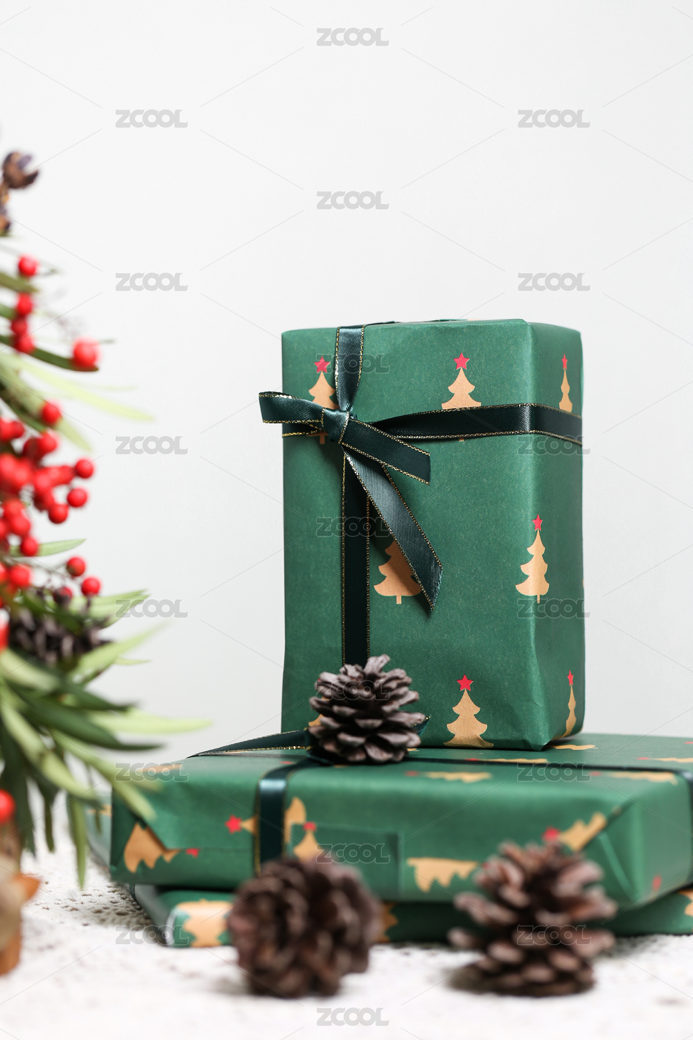 圣诞礼物盒与松枝装饰
