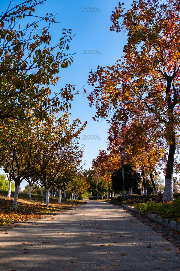 秋天中国安徽省蚌埠市张公山公园景区里的色木槭树和枫叶落叶