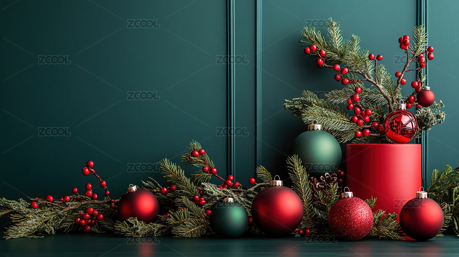 蓝色背景下桌子上圣诞装饰品的特写镜头