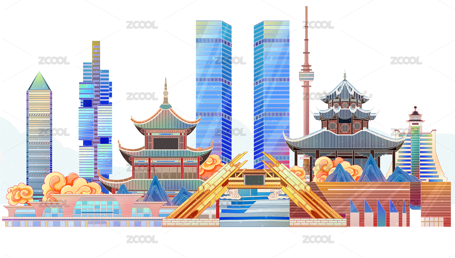 杭州城市地标建筑群矢量插画