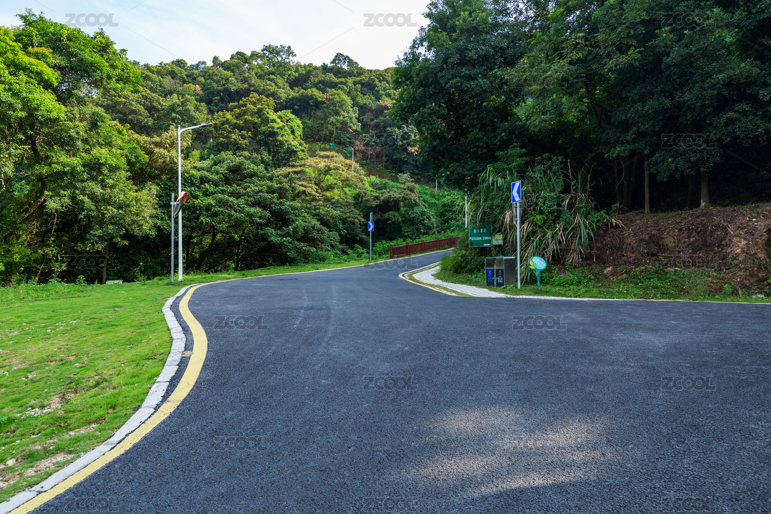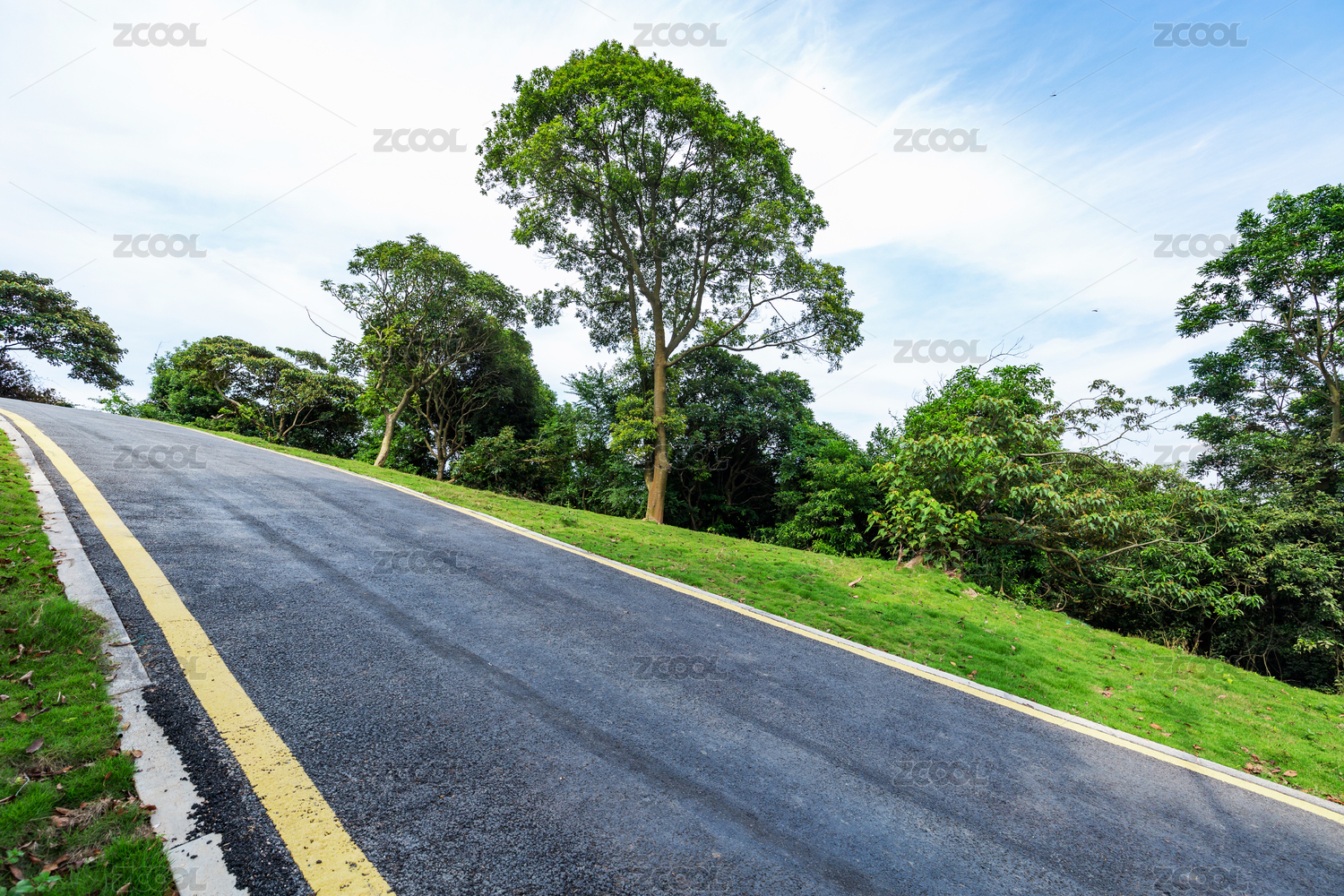 公园沥青道路黄色单实线低角度远景