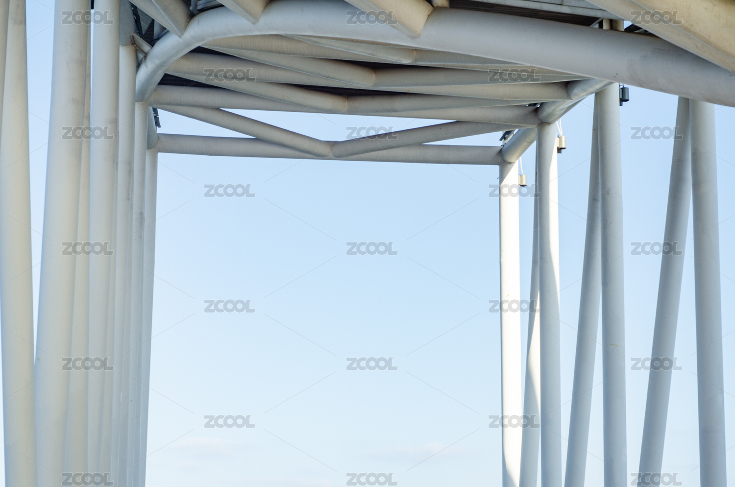 河边风景区里供游客休息的以三角帆状顶棚的休息区