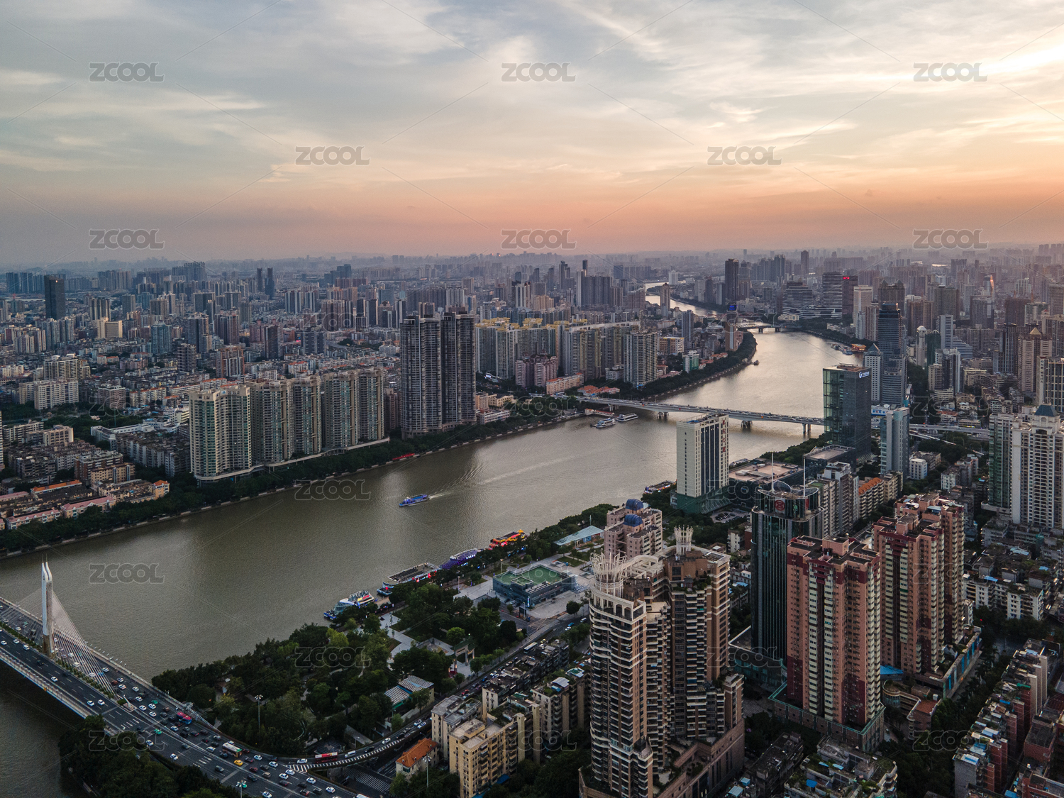 航拍广州珠江两岸城市天际线日落黄昏全景