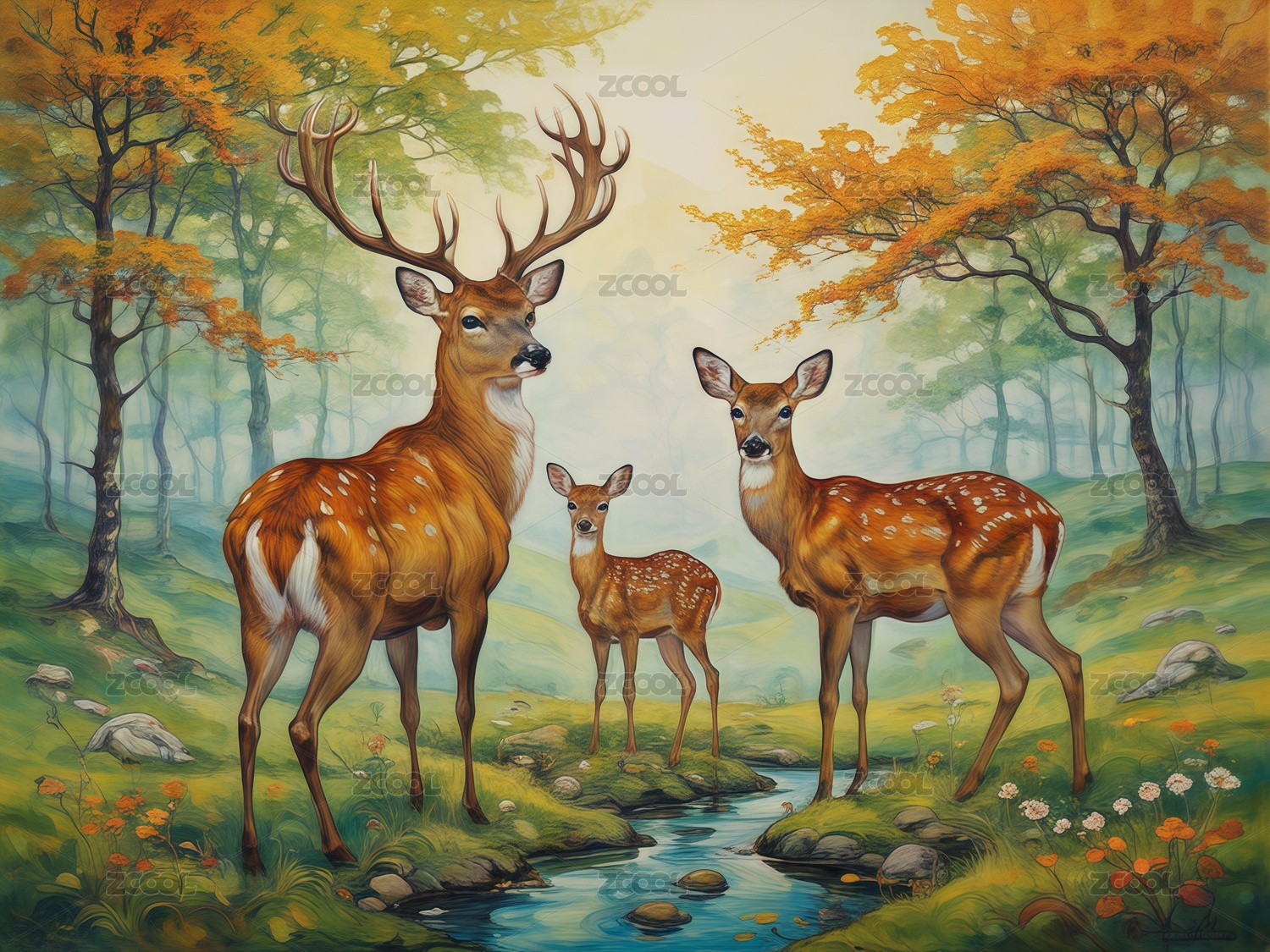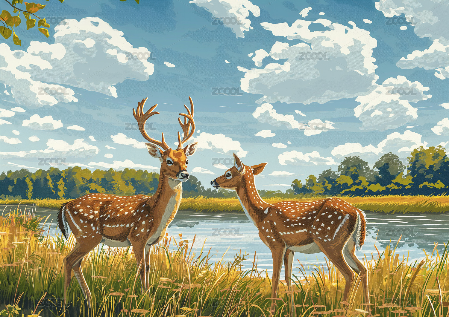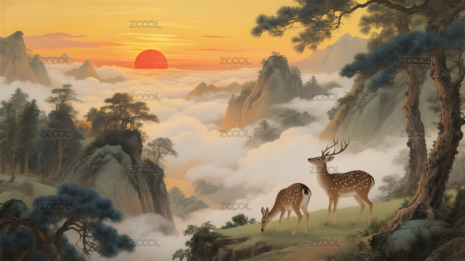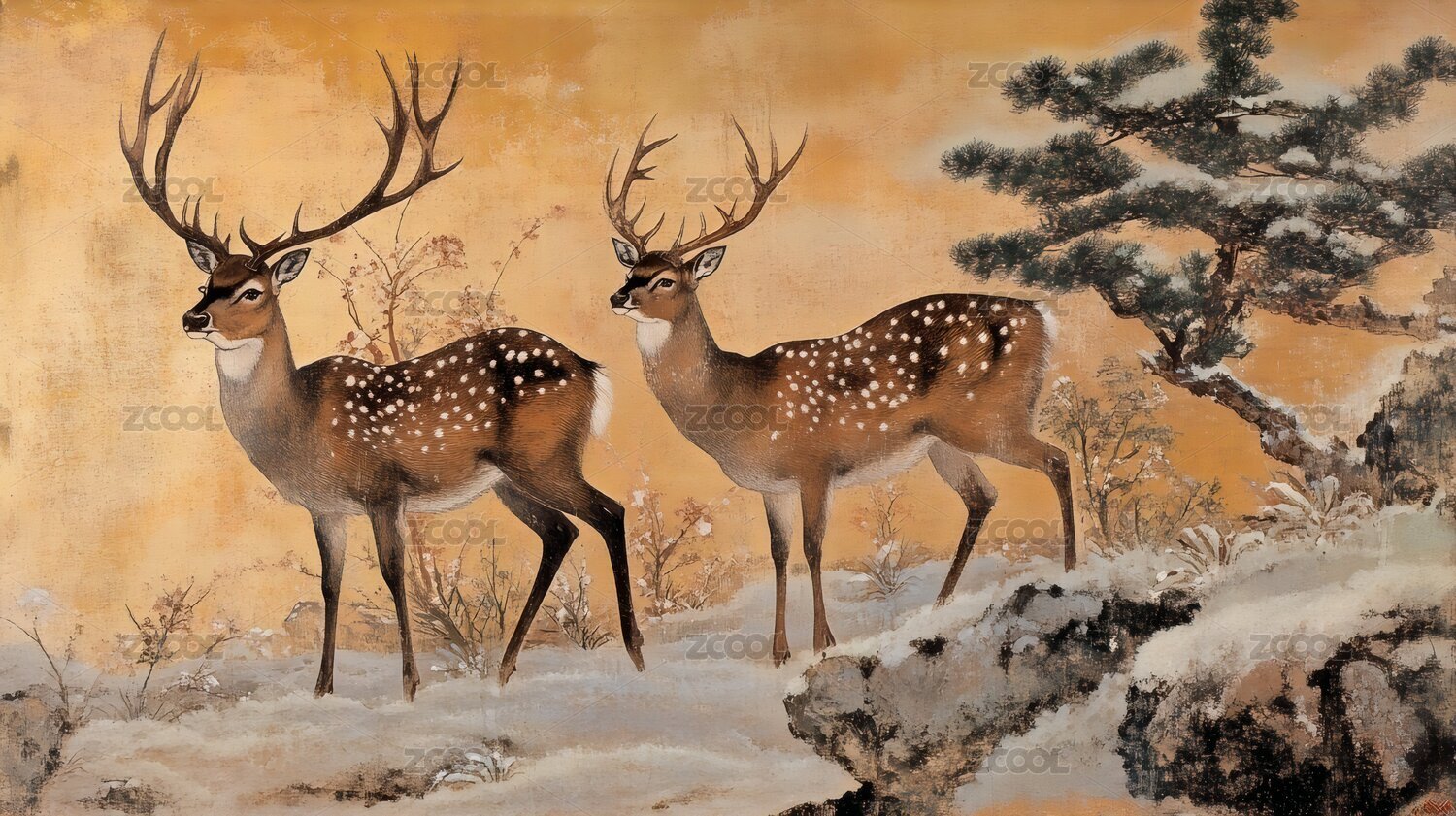 浮世绘动物两只梅花鹿冬天积雪松柏树