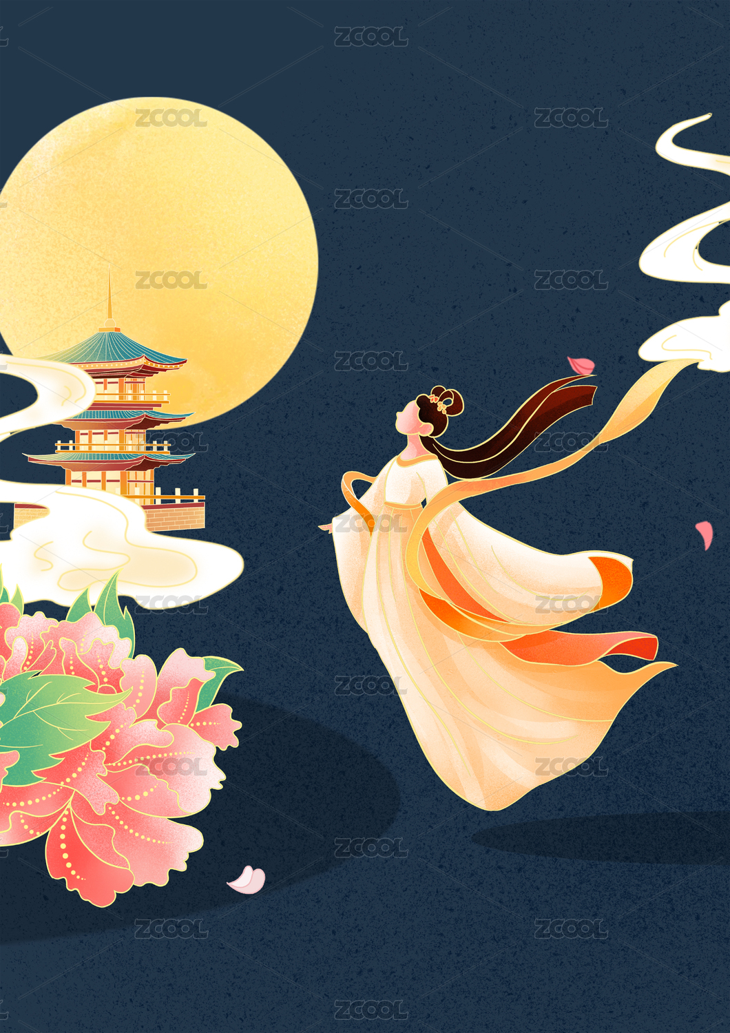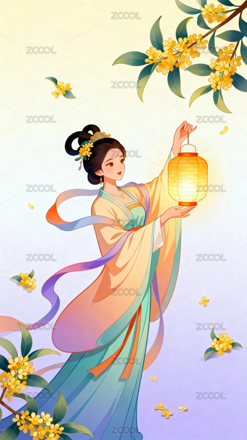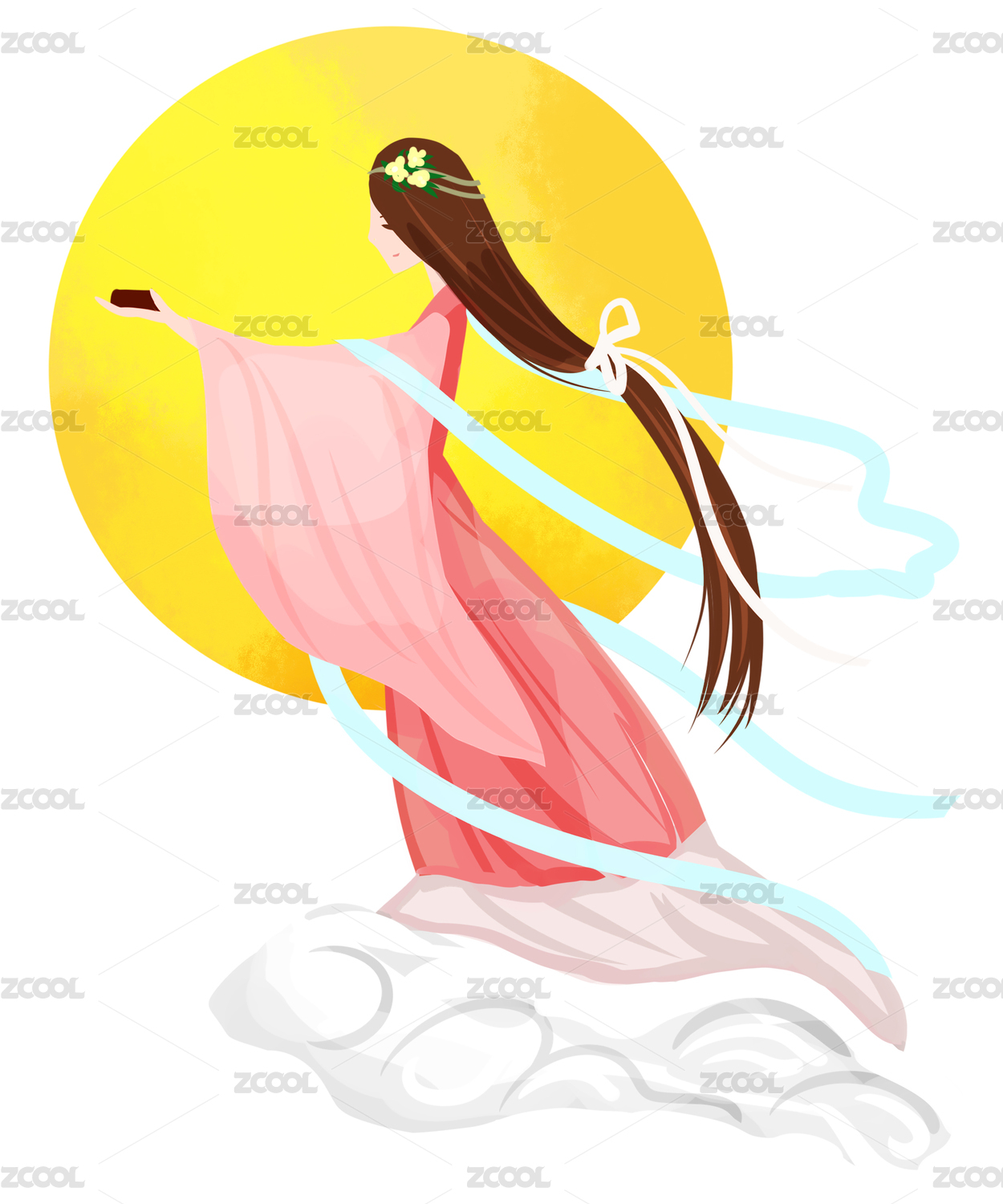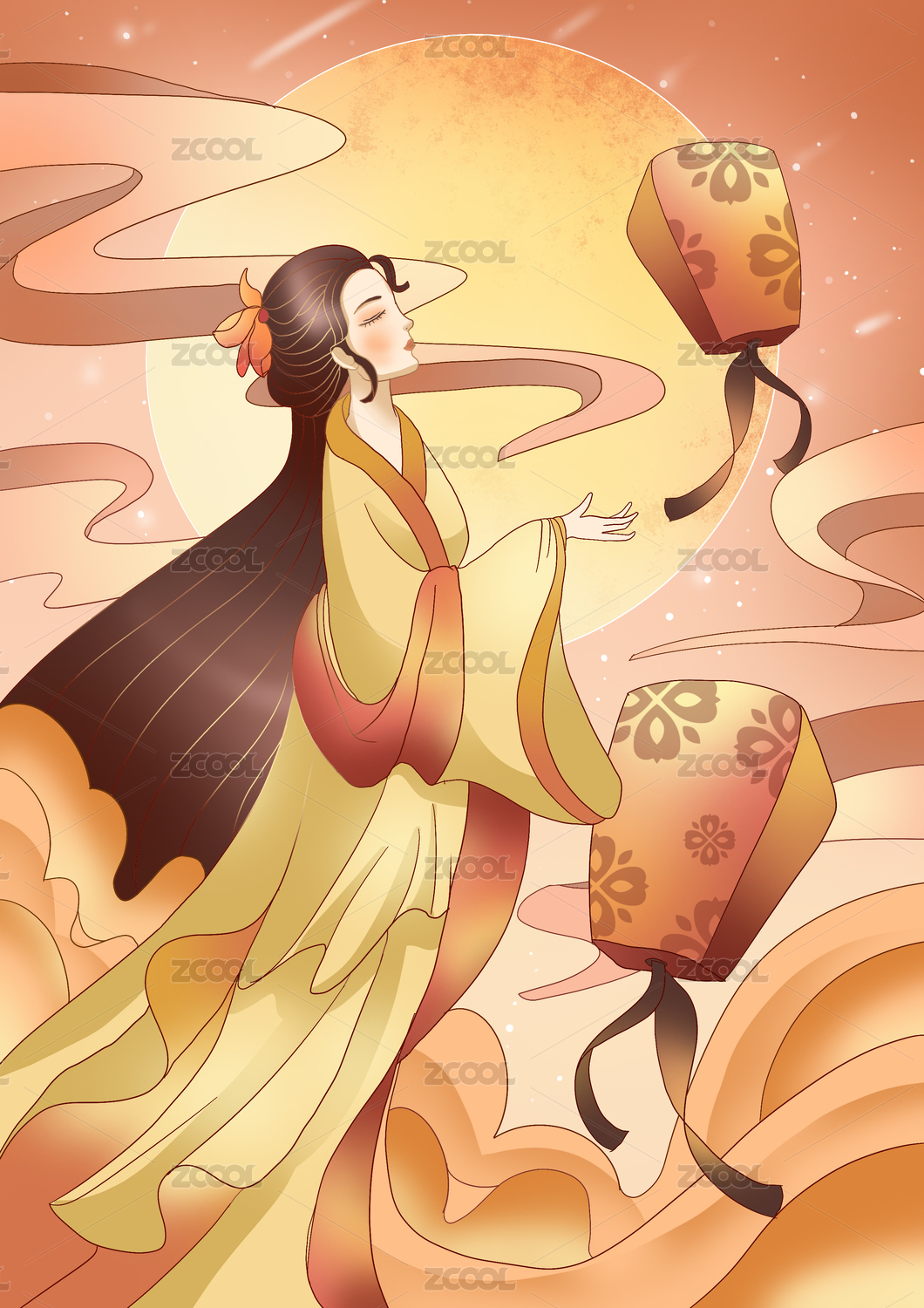 嫦娥在天空中坐在玉兔上打着灯笼 中国风中秋节插画元素