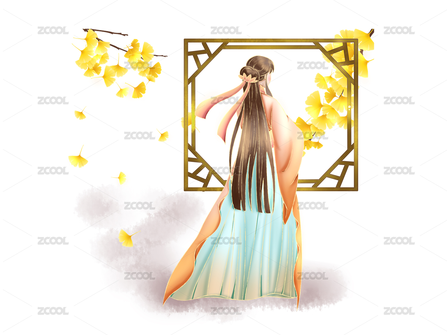 唯美背影看窗外秋分古风女孩和秋天银杏元素