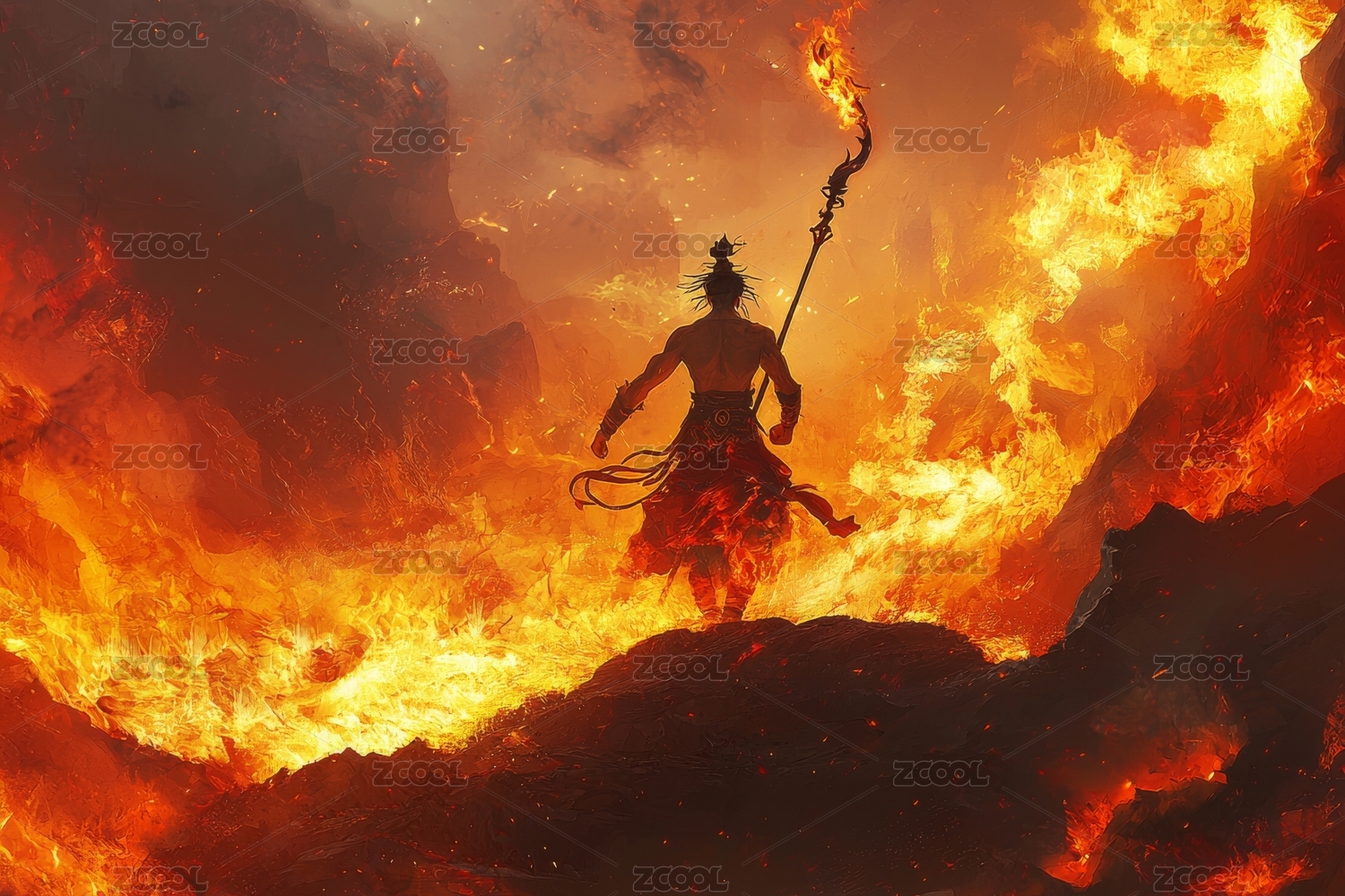 男子,男人,孤独,坚毅,大火,燃烧,火门,大门,台阶,起火