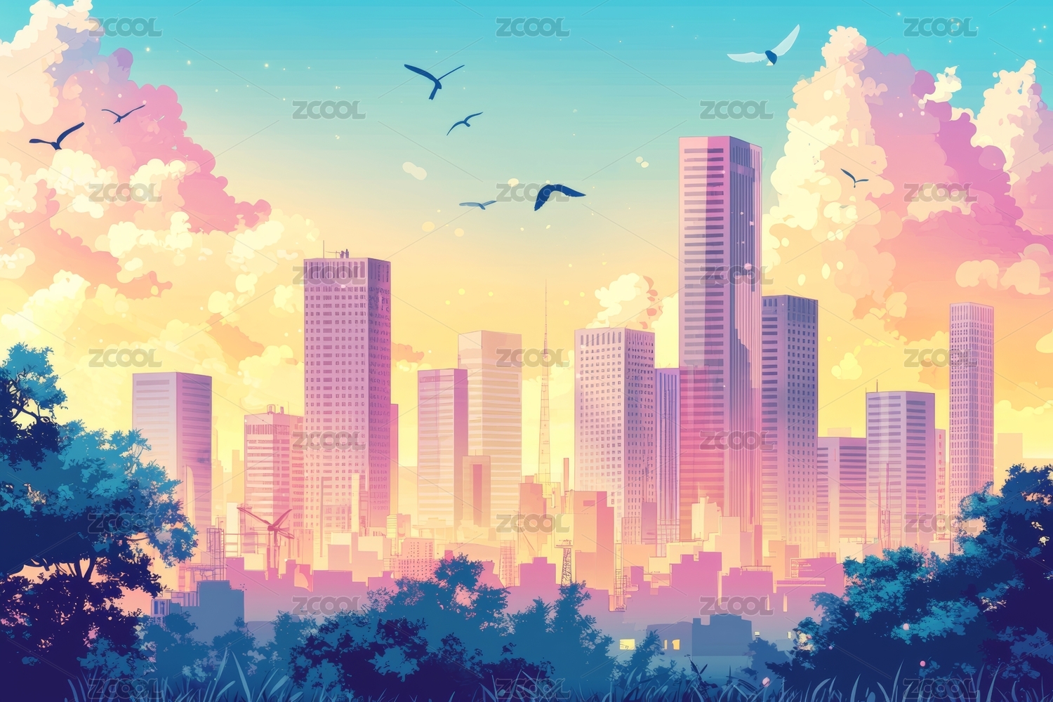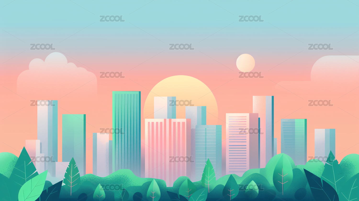 插画,风景,城市,背景,壁纸,底图,金色,天空,建筑,扁平
