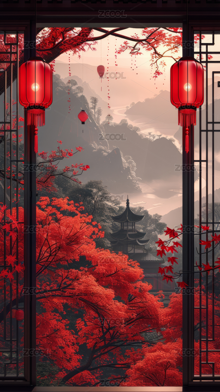 红色灯笼下的中式建筑