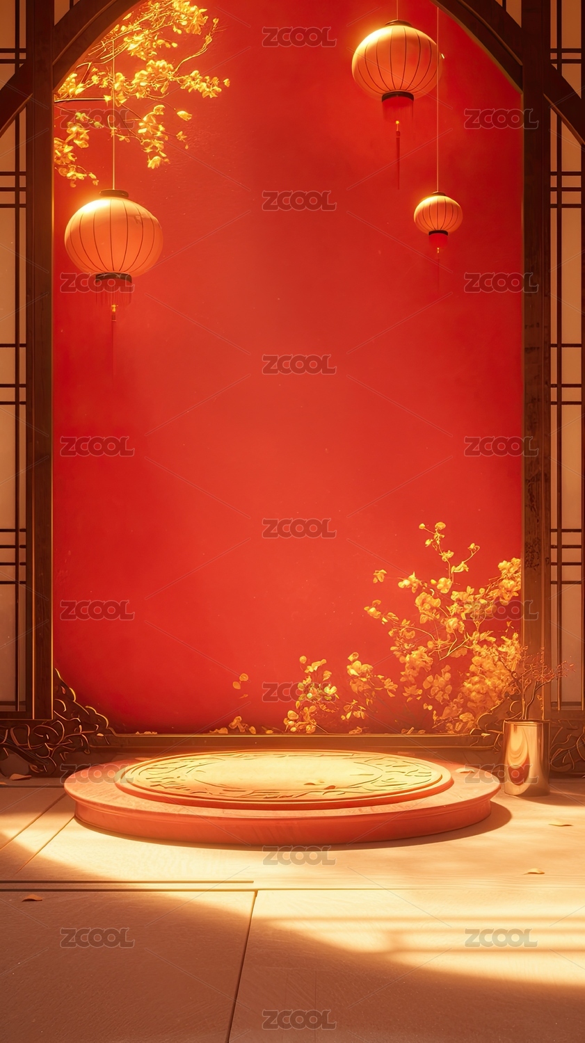 红色背景下的传统灯笼与圆形舞台