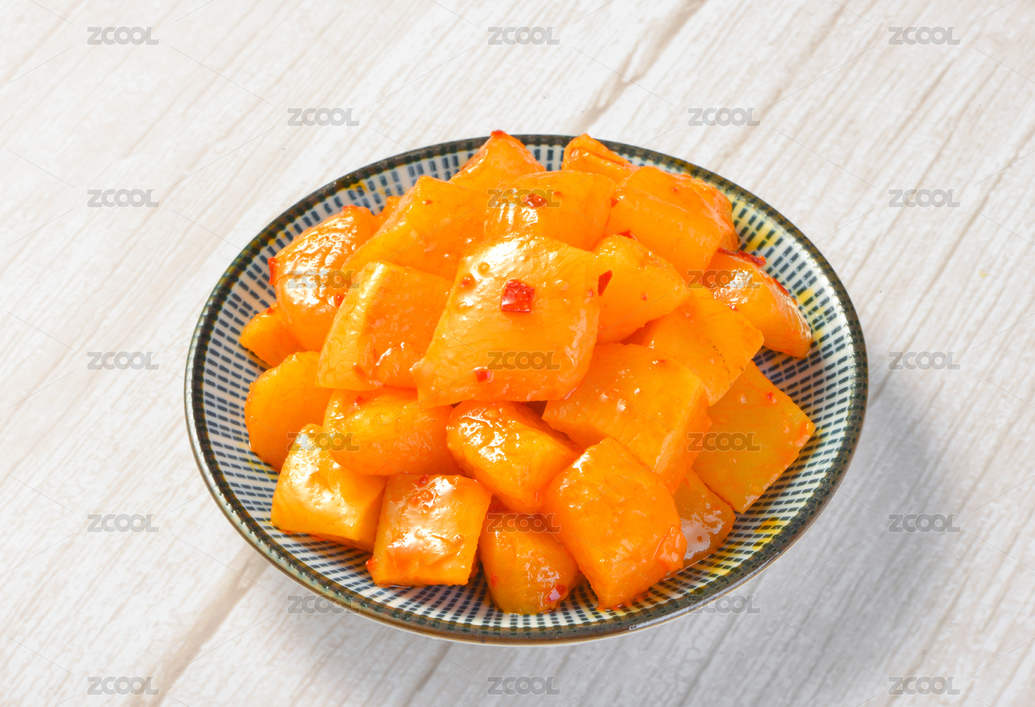 桌面上的盘子里的美味可口的香辣萝卜丁