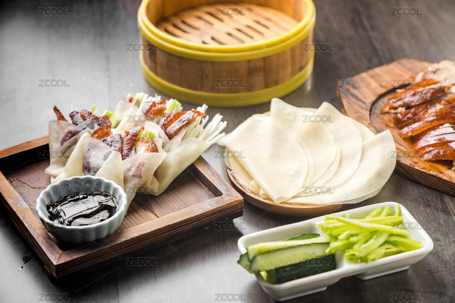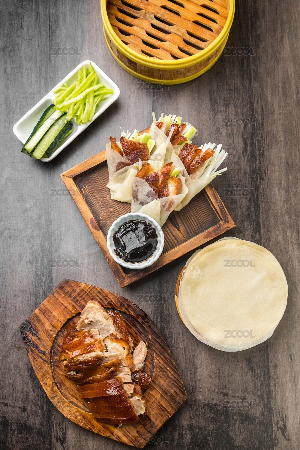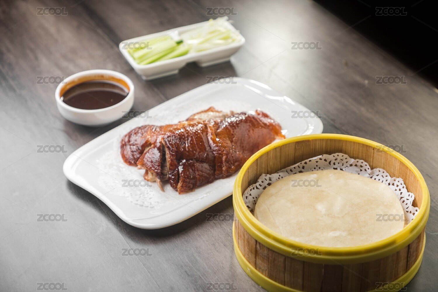 烤鸭,春饼,黄瓜条,甜面酱,木碟子,油汪汪,白色瓷盘,暗色木纹桌,葱丝,蘸酱