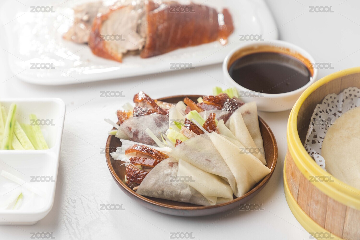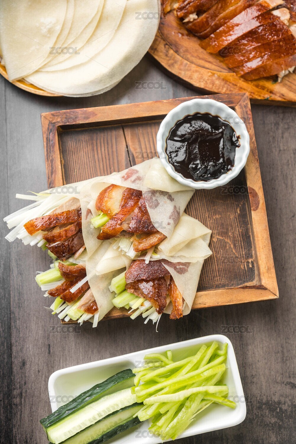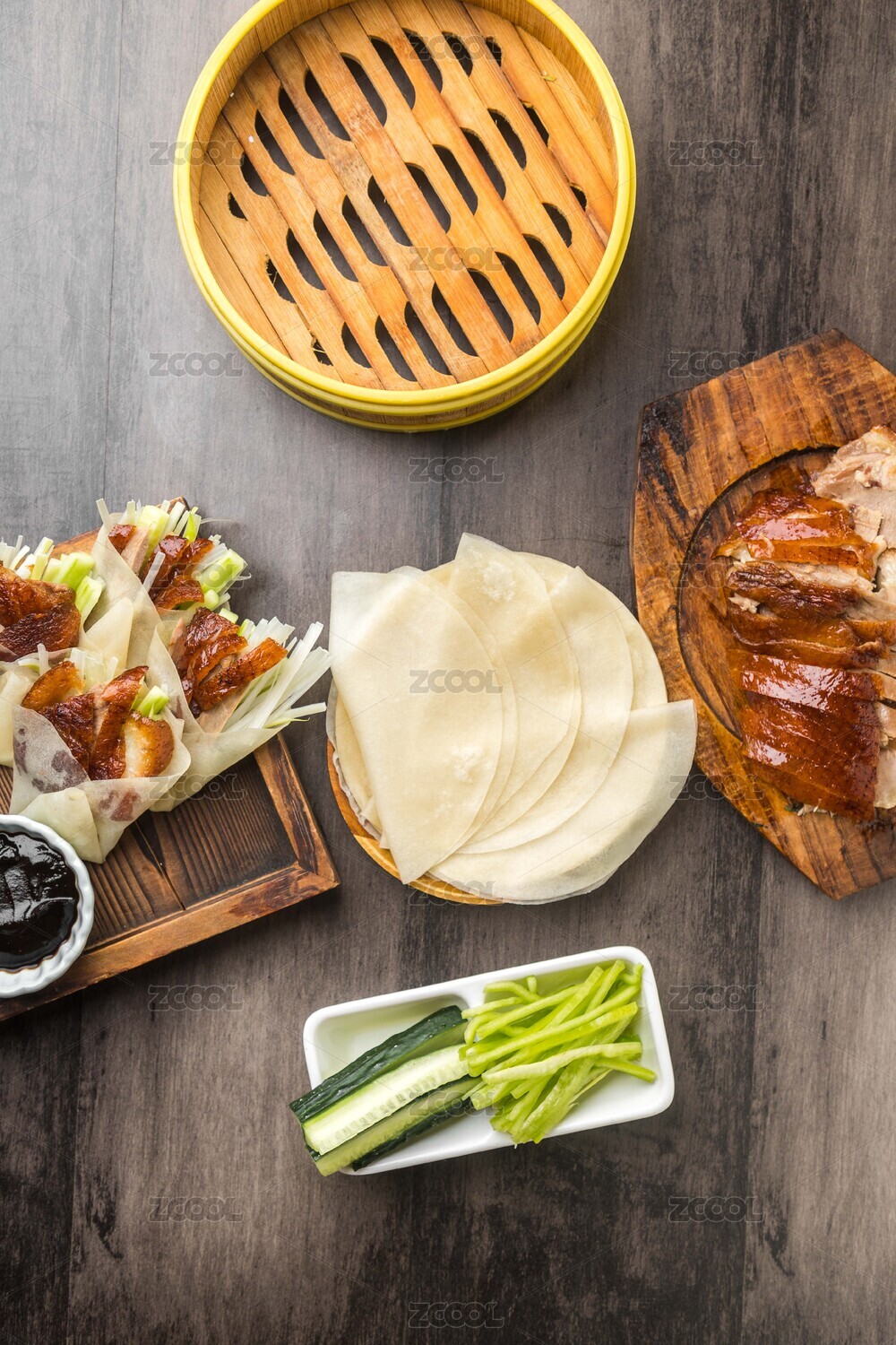 烤鸭,春饼,黄瓜条,甜面酱,木碟子,油汪汪,白色瓷盘,暗色木纹桌,葱丝,蘸酱