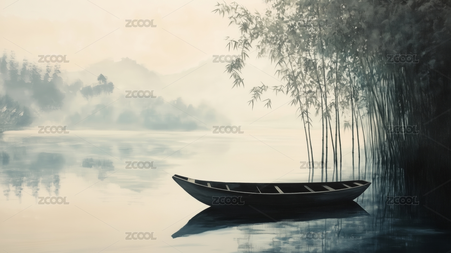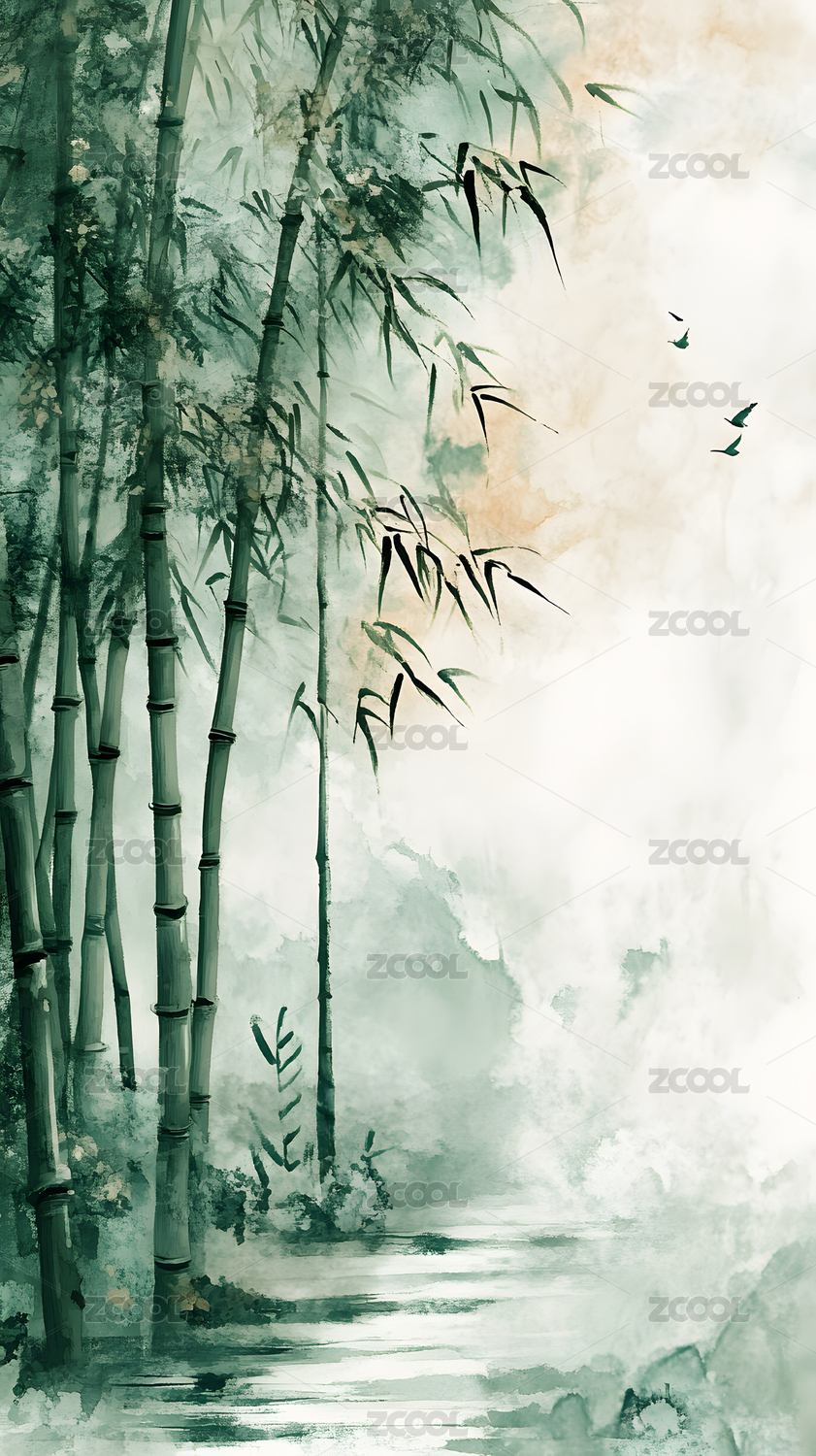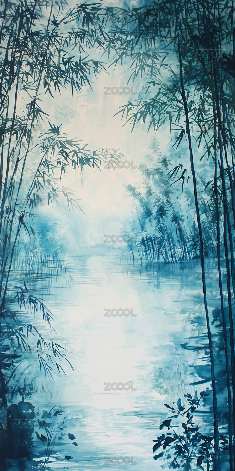 水墨竹林静谧湖畔