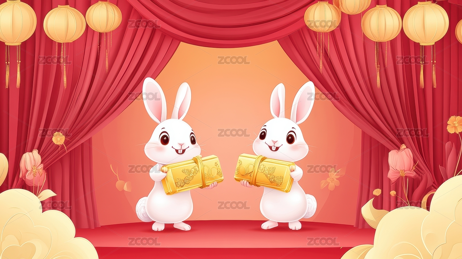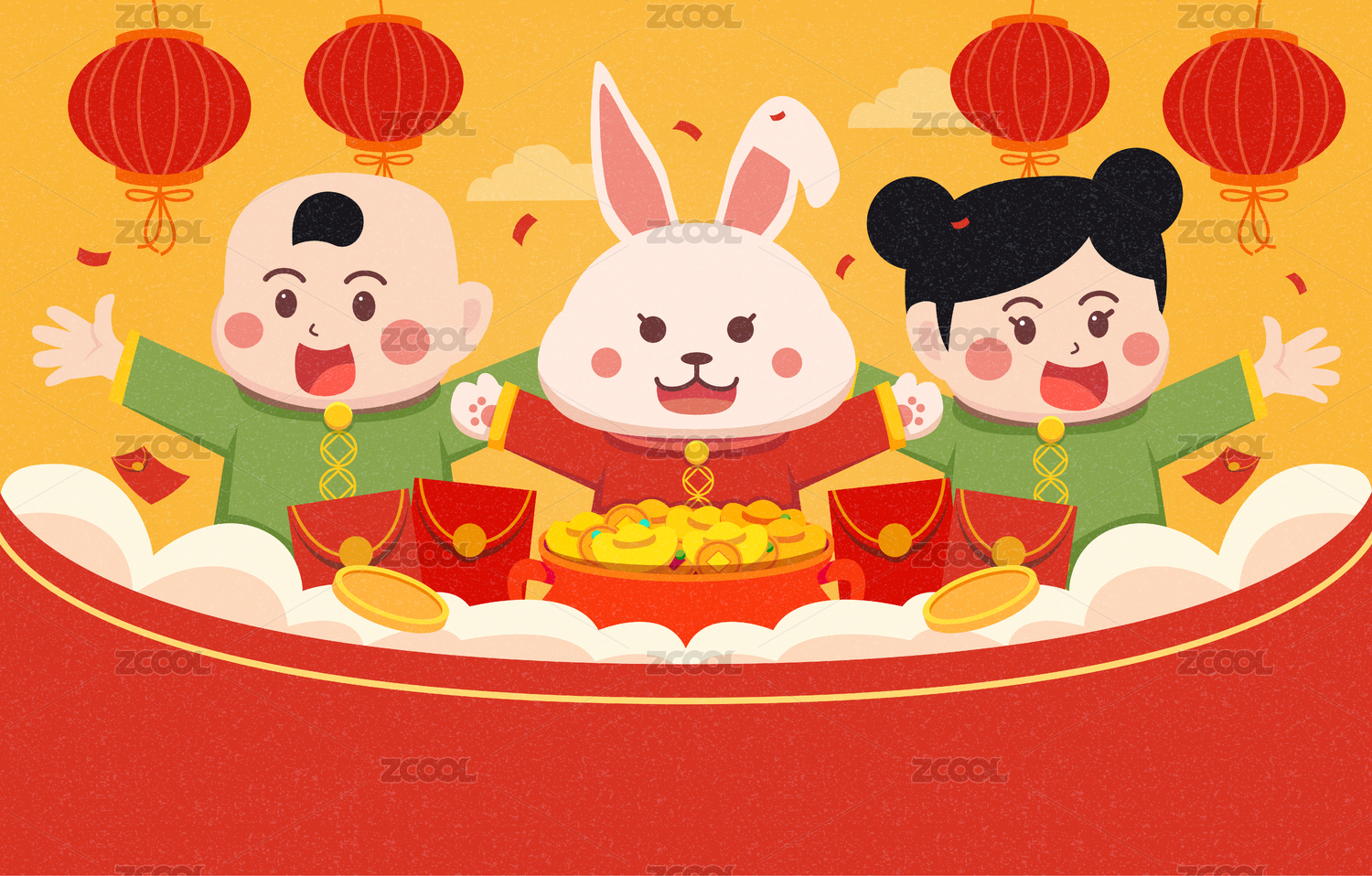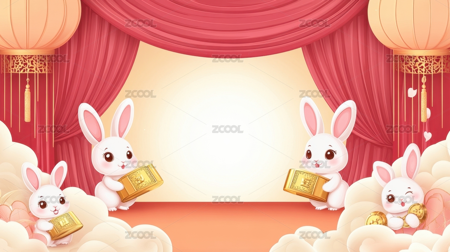 新春小兔子给大家送福送财宝背景插画