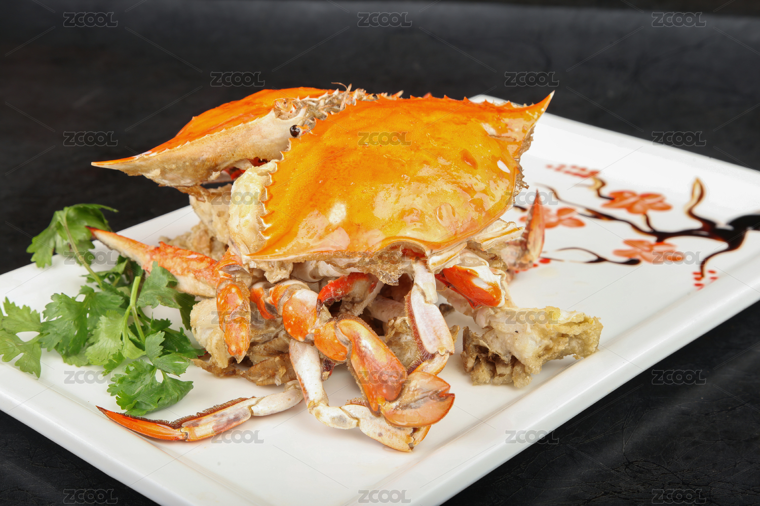 长方形瓷盘装的避风塘炒蟹摆放在黑色背景上