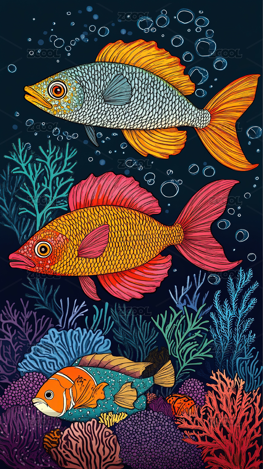 手绘卡通漂亮的鱼类元素花纹背景素材