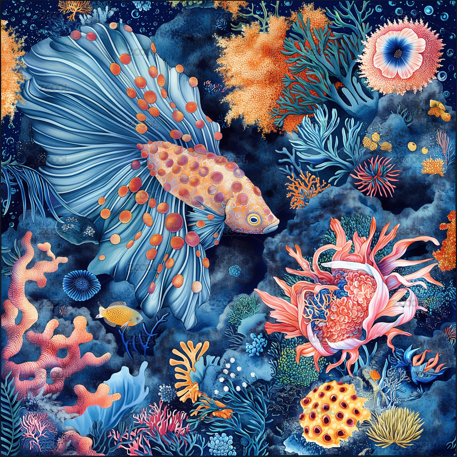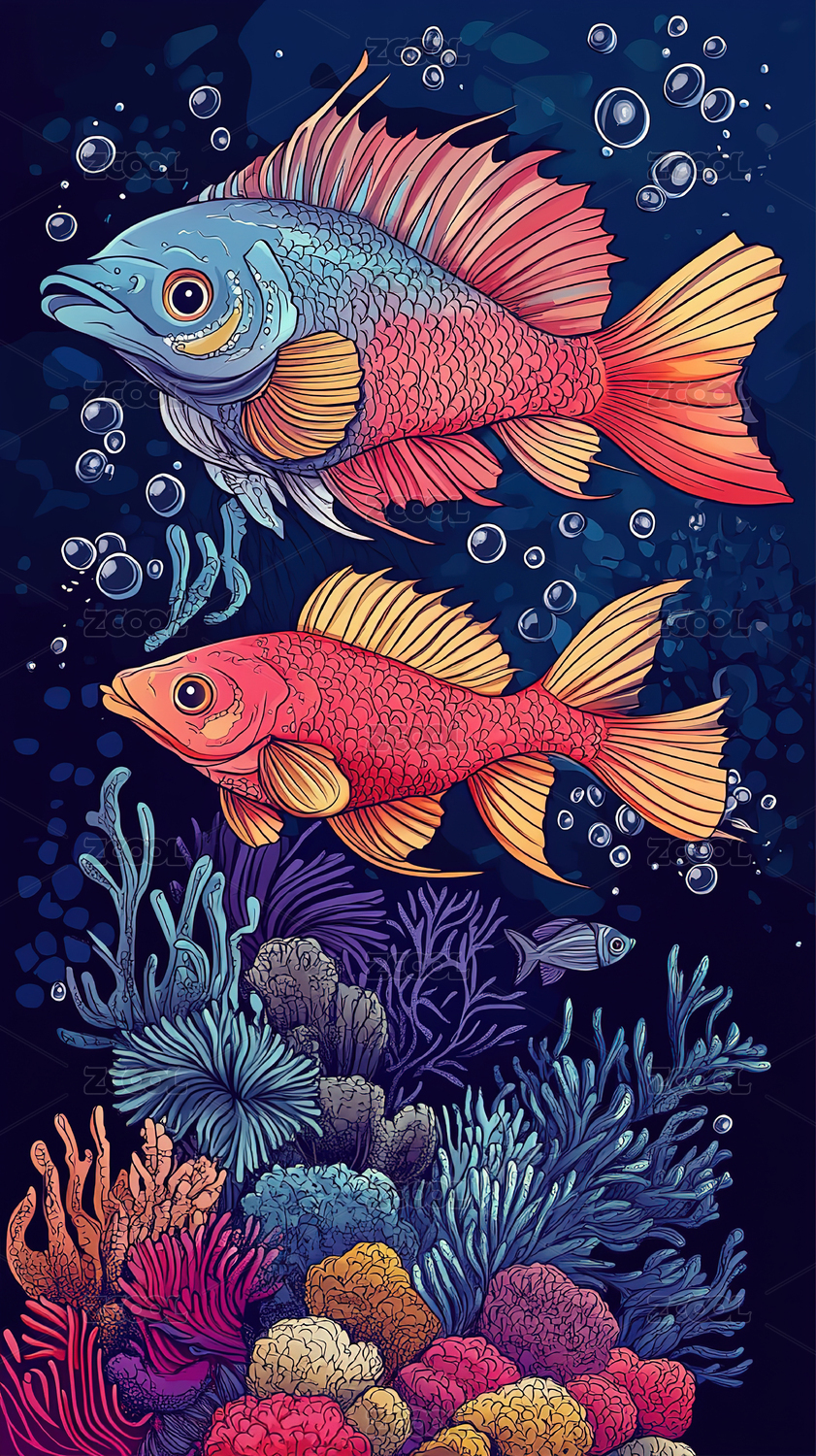 两只热恋中的鱼在五彩缤纷的珊瑚礁中畅游