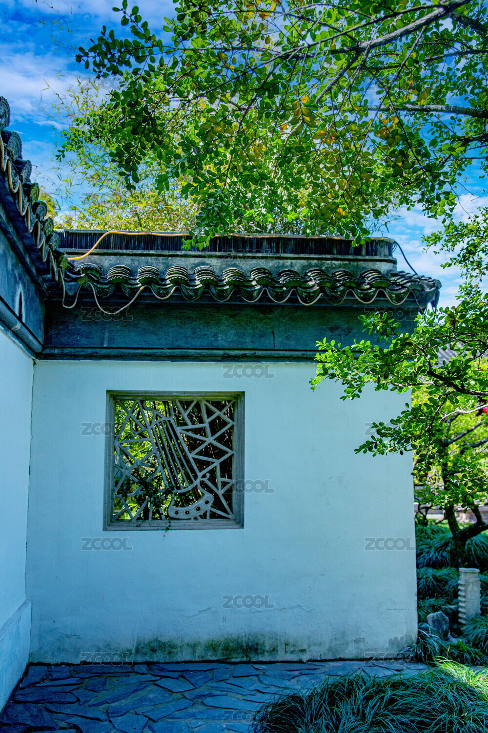 江南园林一角的花窗与绿竹光影