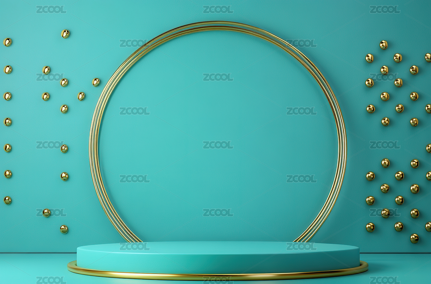 展台上是蓝色背景和金色线条和金色的球体